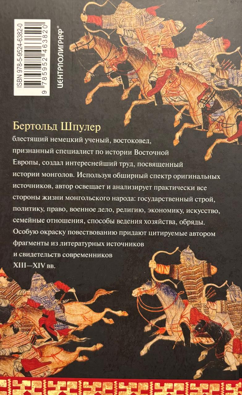 Bertolds Spūlers, izcils vācu zinātnieks, orientālists un atzīts Austrumeiropas vēstures eksperts, ir radījis aizraujošu darbu, kas veltīts mongoļu vēsturei. Balstoties uz plašu oriģinālavotu klāstu, autors izgaismo un analizē praktiski visus mongoļu dzīves aspektus: valdību, politiku, likumus, militārās lietas, reliģiju, ekonomiku, mākslu, ģimenes attiecības, lauksaimniecības metodes un rituālus. Autora citāti no literāriem avotiem un laikabiedru liecībām no 13. un 14. gadsimta piešķir stāstījumam īpašu garšu.