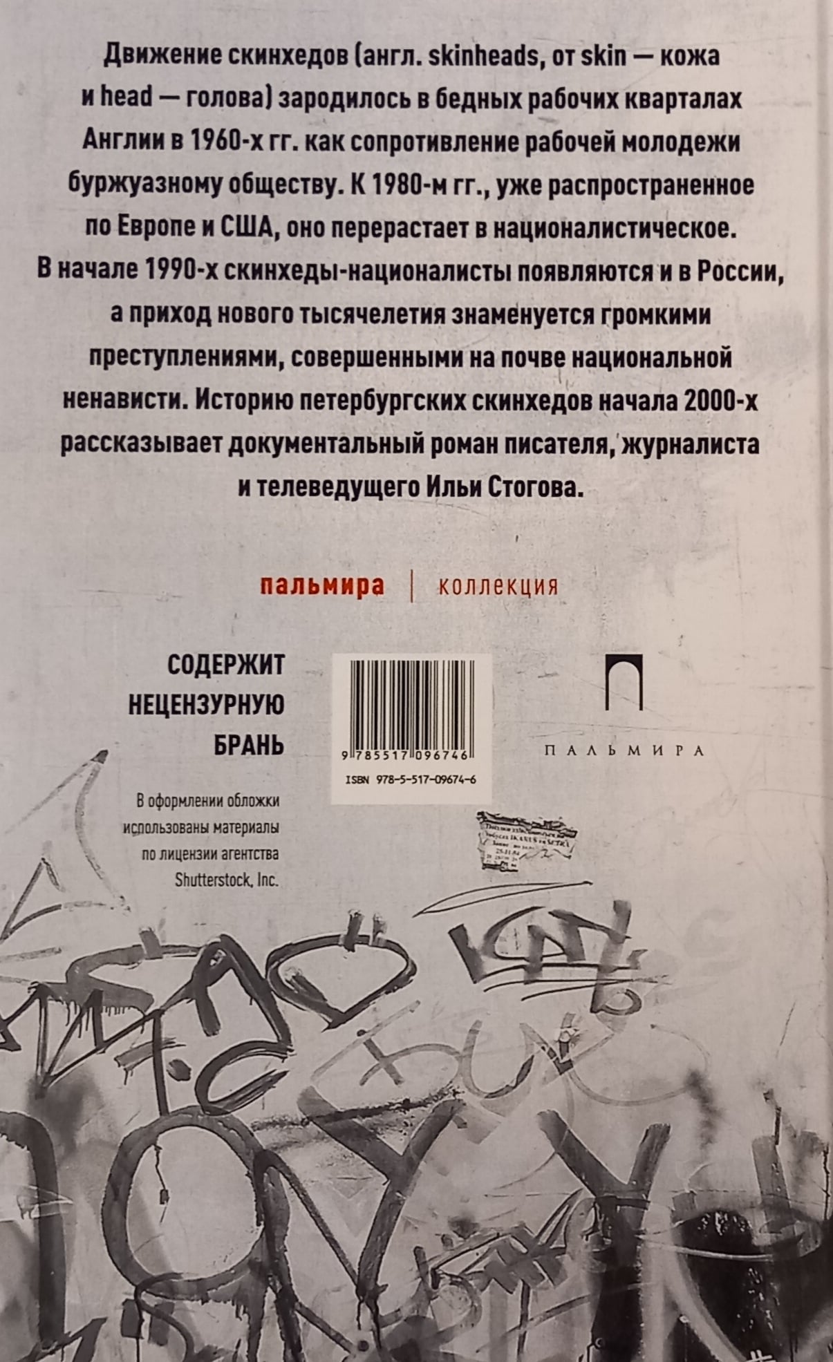 Pirmās skinheads - ekstrēmu nacionālistisku uzskatu jauniešu subkultūras pārstāvju - grupas Krievijā parādījās 90. gadu sākumā. Rakstnieka, žurnālista un TV raidījumu vadītāja Iļjas Stogova dokumentālais romāns stāsta par skandalozākajiem skinheads noziegumiem Sanktpēterburgā jaunās tūkstošgades sākumā.