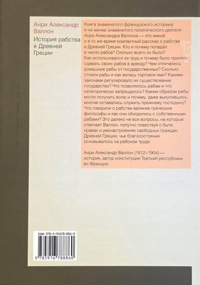 Anrī Aleksandra Valona darbs "Verdzības vēsture Senajā Romā" ir klasisko pētījumu klasika. Tas un Valona agrākais darbs "Verdzības vēsture Senajā Grieķijā" ir iedvesmojuši daudzus pētījumus par verdzību, taču, iespējams, neviens nepārspēj viņa darbu izpratnes plašuma un dziļuma ziņā. No kurienes nāca vergi, cik to bija, kur tie tika izmantoti, cik tie maksāja, kāds bija to statuss romiešu juristu acīs, uz kāda pamata vergi tika atbrīvoti un kādu vietu sabiedrībā ieņēma brīvie — tas ir tikai īss jautājumu saraksts, uz kuriem Valons atbild. Un vissvarīgākais jautājums: kā verdzība, Senās Romas ekonomikas pamats, ietekmēja tās pilntiesīgo pilsoņu mentalitāti? Tieši šī ietekme, pēc Valona domām, kļuva par vienu no šķietami mūžīgās Romas impērijas krišanas iemesliem. Tulkojums tika veikts īpaši šim izdevumam. Anrī Aleksandrs Valons (1812–1904) bija franču vēsturnieks un politiķis, Trešās republikas konstitūcijas autors Francijā.