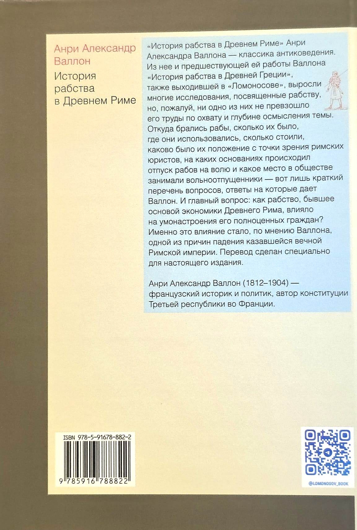 Anrī Aleksandra Valona darbs "Verdzības vēsture Senajā Romā" ir klasisko pētījumu klasika. Tas un Valona agrākais darbs "Verdzības vēsture Senajā Grieķijā" ir iedvesmojuši daudzus pētījumus par verdzību, taču, iespējams, neviens no tiem nepārspēj viņa darbu izpratnes plašumā un dziļumā. No kurienes nāca vergi, cik to bija, kur tie tika izmantoti, cik tie maksāja, kāds bija to statuss romiešu juristu acīs, uz kāda pamata vergi tika atbrīvoti un kādu vietu sabiedrībā ieņēma atbrīvotie — tas ir tikai īss saraksts ar jautājumiem, uz kuriem Valons atbild. Un vissvarīgākais jautājums: kā verdzība, Senās Romas ekonomikas pamats, ietekmēja tās pilntiesīgo pilsoņu mentalitāti? Tieši šī ietekme, pēc Valona domām, kļuva par vienu no šķietami mūžīgās Romas impērijas krišanas iemesliem. Tulkojums tika veikts speciāli šim izdevumam.