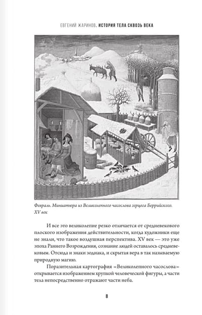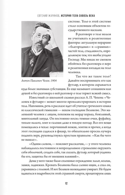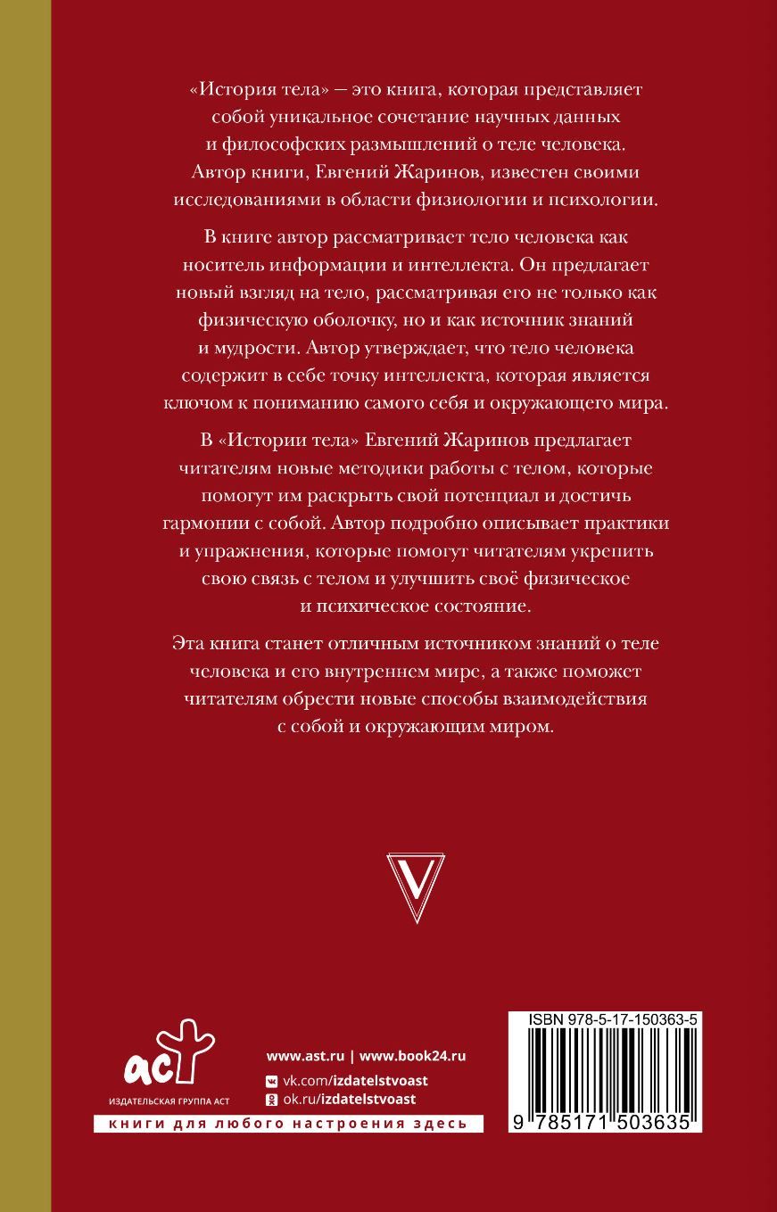 "Ķermeņa vēsture" ir grāmata, kas ir unikāls zinātnisko datu un filozofisko pārdomu par cilvēka ķermeni apvienojums. Grāmatas autors Jevgeņijs Žarinovs ir pazīstams ar saviem pētījumiem fizioloģijas un psiholoģijas jomā. Grāmatā autors aplūko cilvēka ķermeni kā informācijas un intelekta nesēju. Viņš piedāvā jaunu skatījumu uz ķermeni, uzskatot to ne tikai par fizisku apvalku, bet arī par zināšanu un gudrības avotu. Autors apgalvo, ka cilvēka ķermenī ir intelekta punkts, kas ir atslēga sevis un apkārtējās pasaules izpratnei.
