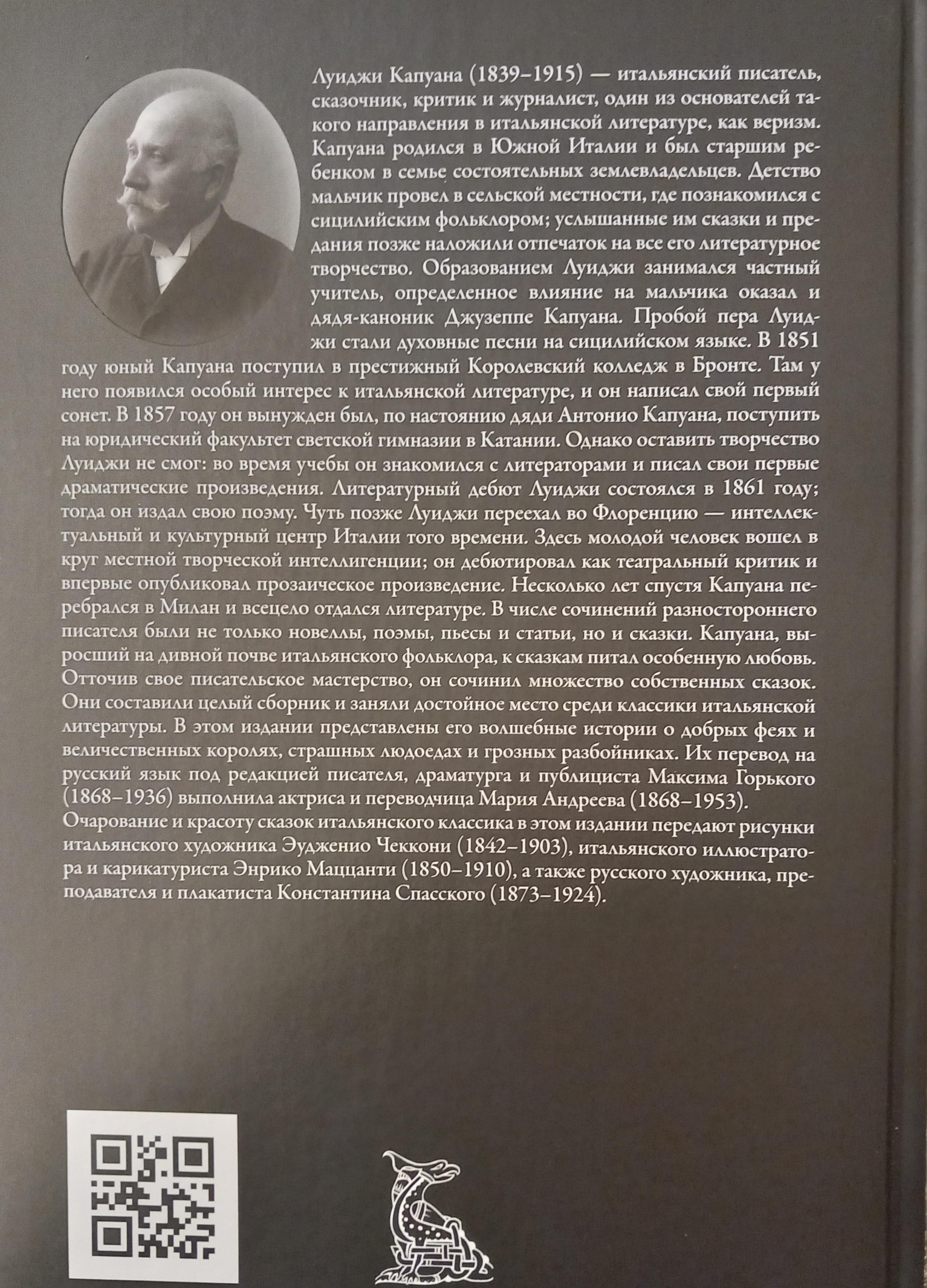Luidži Kapuana (1839–1915) bija itāļu rakstnieks, stāstnieks, kritiķis un žurnālists, viens no verismo kustības pamatlicējiem itāļu literatūrā. Divpadsmit brīnišķīgās šī autora itāļu pasakas, kas iekļautas šajā izdevumā, rotā trīs zīmēšanas meistaru – Konstantīna Spaska, Enriko Mazanti un Jevgeņio Čekoni – ilustrācijas.