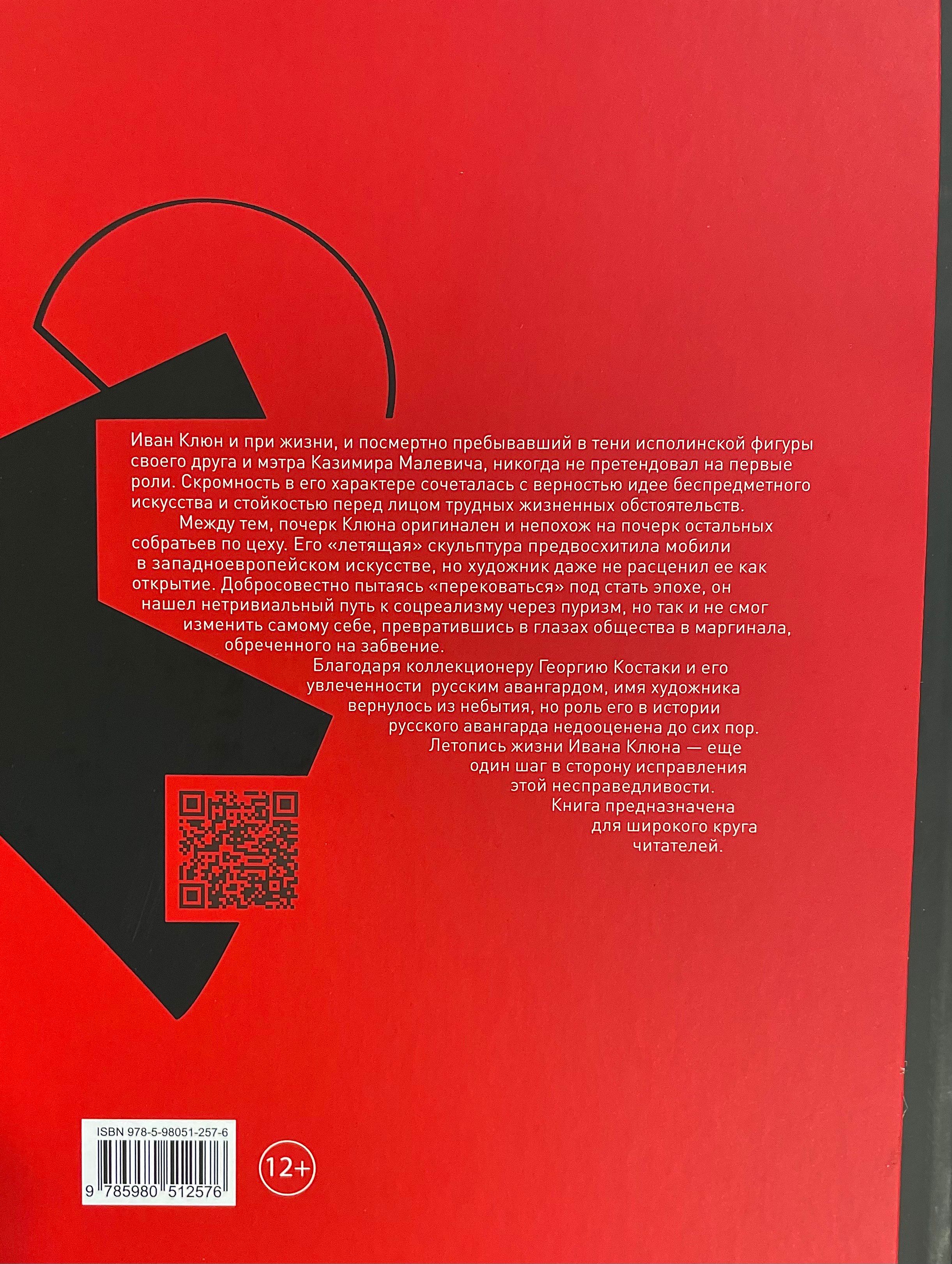 Ivans Kļuns gan savas dzīves laikā, gan pēc nāves palika sava drauga un skolotāja Kazimira Maļeviča gigantiskās figūras ēnā un nekad nepretendēja uz galvenajām lomām. Pieticība viņa raksturā tika apvienota ar lojalitāti neobjektīvas mākslas idejai un nelokāmību sarežģītos dzīves apstākļos. Tikmēr Kļuna rokraksts ir oriģināls un atšķirīgs no viņa kolēģu mākslinieku rokraksta. Viņa “lidojošā” skulptūra paredzēja mobilās ierīces Rietumeiropas mākslā, taču mākslinieks to pat neuzskatīja par atklājumu. Apzinīgi cenšoties sevi “pārveidot” atbilstoši laikam, viņš caur purismu atrada ne triviālu ceļu uz sociālistisko reālismu, taču nekad nespēja sevi mainīt, sabiedrības acīs kļūstot par marginālu figūru, kas lemta aizmirstībai. Pateicoties kolekcionāram Džordžam Kostakim un viņa aizrautībai ar krievu avangardu, mākslinieka vārds ir atgriezies no aizmirstības, taču viņa loma krievu avangarda vēsturē līdz pat šai dienai joprojām ir nenovērtēta. Ivana Kļuna dzīves hronika ir vēl viens solis šīs netaisnības labošanā. Grāmata paredzēta plašam lasītāju lokam.