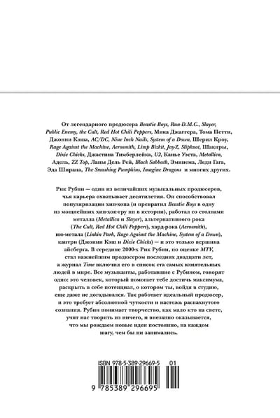 Riks Rubins ir viens no izcilākajiem mūzikas producentiem, kura karjera ilgst gadu desmitiem. Viņš palīdzēja popularizēt hiphopu (un pārvērta Beastie Boys par vienu no visu laiku spēcīgākajām hiphopa grupām), strādājis ar metāla (Metallica un Slayer), alternatīvā roka (The Cult, Red Hot Chili Peppers), hardroka (Aerosmith), nu-metāla (Linkin Park, Rage Against the Machine, System of a Down), kantrimūzikas (Johnny Cash and the Dixie Chicks) pīlāriem - un tā ir tikai aisberga redzamā daļa. 2000. gadu vidū MTV Riku Rubinu uzskatīja par pēdējo 20 gadu svarīgāko producentu, un žurnāls Time iekļāva viņu savā 100 ietekmīgāko cilvēku pasaulē sarakstā. Ikviens mūziķis, kurš ir strādājis ar Rubinu, saka vienu un to pašu: viņš ir cilvēks, kurš palīdz sasniegt maksimumu, atklājot sevī potenciālu, par kuru pat nezināji, ka tāds ir, ieejot studijā. Tā strādā ideāls producents, un tas prasa absolūtu jūtīgumu un plaši atvērtu prātu. Rubins izprot radošumu tā, kā tikai retais pasaulē, māca mums radīt no nekā, un pēkšņi izrādās, ka mēs pastāvīgi ģenerējam jaunas idejas, katrā solī, neatkarīgi no tā, ko mēs darām.