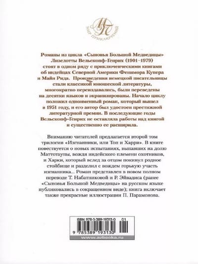 Lizelotes Velskopfas-Heinrihas cikla "Lielā lāča dēli" romāni stāv vienā rindā ar Fenimora Kūpera un Meinas Reida piedzīvojumu grāmatām par Ziemeļamerikas indiāņiem. Vācu rakstnieka darbi kļuvuši par jauniešu literatūras klasiku, daudzkārt pārpublicēti, tulkoti desmitiem valodu un filmēti. Cikls sākās ar tāda paša nosaukuma romānu, kas tika izdots 1951. gadā, un tā autors tika apbalvots ar prestižu literāro balvu. Nākamajos gados Velskopfs-Heinrihs turpināja darbu pie grāmatas un to ievērojami paplašināja. Pirmais pilnais izdevums trīs sējumos tika izdots 60. gadu sākumā (vēlāk sērija tika izdota arī sešos sējumos). Par aktīvo atbalstu Ziemeļamerikas indiāņiem Oglalas cilšu savienība rakstniecei piešķīra goda nosaukumu Lakota-Tašina, Lakotas aizstāve. Lasītāju uzmanībai tiek piedāvāts triloģijas otrais sējums “Trimdītie jeb Tops un Harijs”. Grāmatā stāstīts par jauniem pārbaudījumiem, kas piemeklējuši indiāņu mednieku cilts vadoni Mattotaupu un Harki, kurš, sekojot tēvam, pameta dzimto nometni un kopā ar vadoni piemeklēja trimdas rūgto likteni... Romāns jaunā pilnā tulkojumā ir T. Nabatņikovas un R. Eivadisa (agrāk tika izdots "The Sons of the Bigridge"). Grāmatā iekļautas arī brīnišķīgas P. Paramonova ilustrācijas.