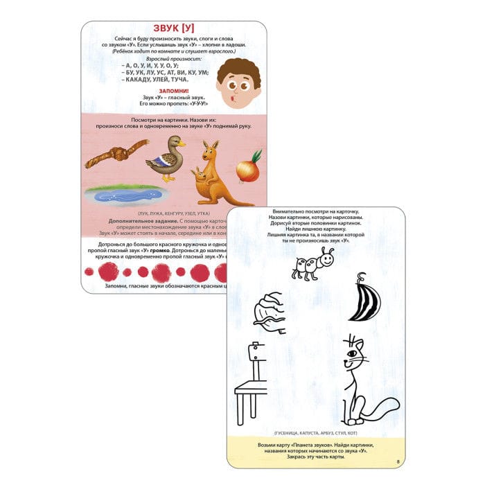 — "Noteikt skaņas vietu vārdā". Uzdevums iemācīs bērnam noteikt skaņu vārda sākumā, beigās vai vidū, palīdzēs bērnam sadzirdēt skaņu jebkurā vārda vietā un novērsīs turpmākās rakstības kļūdas.