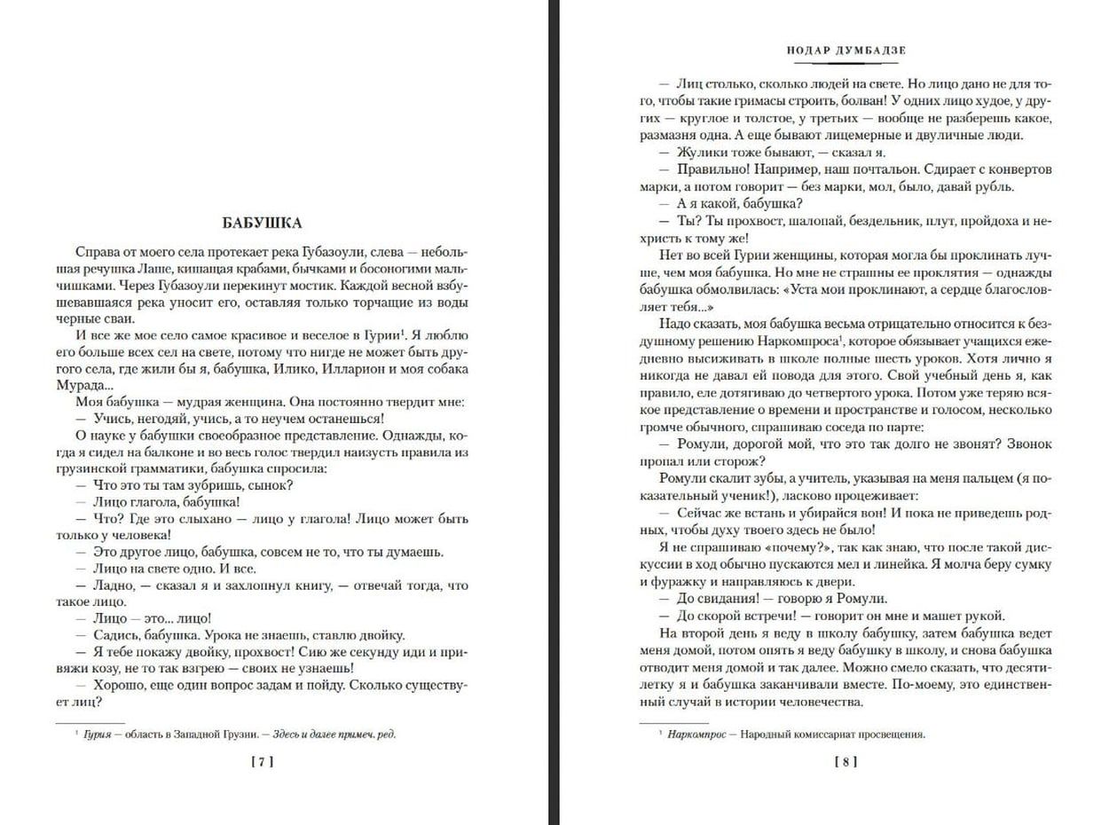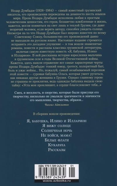 Nodars Dumbadze (1928–1984) ir slavenākais gruzīnu rakstnieks, viņa darbi ir tulkoti deviņdesmit sešās valodās. Nodara Dumbadzes proza ir piepildīta ar mīlestību pret vienkāršām cilvēciskām vērtībām, viņa varoņi, nesavtīgi iemīlējušies dzīvē, šķiet dzimuši tikai siltajā Gruzijā, kur pat akls cilvēks, ja ticam autoram, spēj ieraudzīt sauli. Neskatoties uz to, ka Nodars Dumbadze bija plaši pazīstams visā Padomju Savienībā, lielākā daļa viņa darbu krievu valodā nav publicēti ilgu laiku. Šis izdevums cenšas labot šo nelaimīgo izlaidumu - tajā iekļauti slaveni gruzīnu literatūras klasiķa romāni, stāsti un noveles, tostarp slavenākais stāsts "Es, vecmāmiņa, Iliko un Illarions". Tas stāsta par zēnu, kurš uzauga Gruzijas ciematā Lielā Tēvijas kara laikā. Šķiet, šeit atspoguļojas visas raksturīgākās Nodara Dumbadzes prozas iezīmes: smalks humors, groteska, krāsaina dzīve, sāpes un kara šausmas... Bet, iespējams, šī stāsta neaizmirstamākā varone ir bargā vecmāmiņa Olga, kura prot lamāties kā neviena sieviete Gruzijā. Tomēr galvenā varone nebaidās no saviem lāstiem, jo kādu dienu vecmāmiņa atklāja savu noslēpumu: "Manas lūpas lāda, bet mana sirds svētī tevi...".