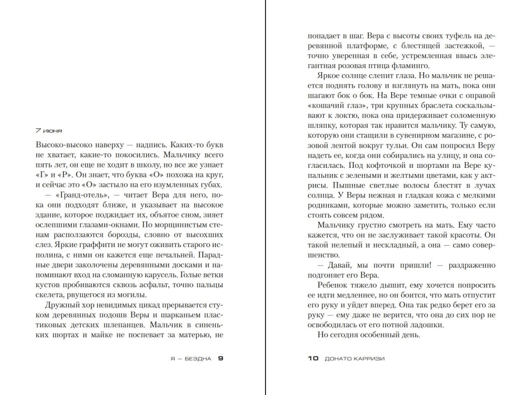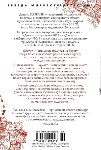 No rīta Apkopējs strādā Komo ezera krastā, pilnībā iegrimis atkritumu izpētē, jo atkritumi vienmēr atklāj tīro patiesību par cilvēkiem. "Esmu neredzams," domā Apkopējs, vēl neapzinoties, ka kļūdās. Viņš daudz ko nezina. Apkopējs nezina, ka pacels galvu un paskatīsies uz ezeru – un viņa neredzamā dzīve, pilna rūgtu atmiņu un vēl asiņaināku noslēpumu, noplūdīs, gatava nogrimt. Un ka izmocīta trīspadsmitgadīga meitene ar violetiem sprādzieniem tūlīt uz viņu paskatīsies – un patiesi viņu redzēs. Un ka Medniece, salauzta sieviete, kas gadus glābusi vardarbības ģimenē upurus, jau ir viņam dzenā un meklē viņu. Apkopējs vēl nezina, ka viņi trīs, bezvārdu vīrieši, katrs iesprostots savās personīgajās šausmās, virzās uz kopīgu sprādzienbīstamu kulmināciju, un viņu likteni izšķirs Komo ezers, kas slēpj un atklāj citu noslēpumus, kad un kā vien tam tīk. Donato Karisī jaunais trilleris "Es esmu bezdibenis" ir romāns par to, kā bezdibenis gaida ikvienu, un ne visi tiks glābti.