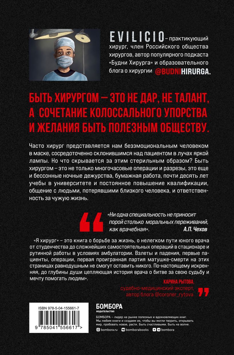 Grāmatas autors ir medicīnas tematikai veltītā top podkāsta "Ķirurga ikdiena" autors. Uzzināsiet par visu, kas raksturīgs ārsta ikdienas darbam: ilgās studijas universitātē, nemitīga zināšanu un prasmju pilnveidošana, pirmie soļi profesijā, garie nakts dežūras, dīvaini un traģiski gadījumi. Jūs ienirsiet īpašajā ķirurģijas nodaļas pasaulē un uzzināsiet, cik grūta var būt šī profesija, pat ja tā ir jūsu īstais aicinājums.