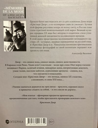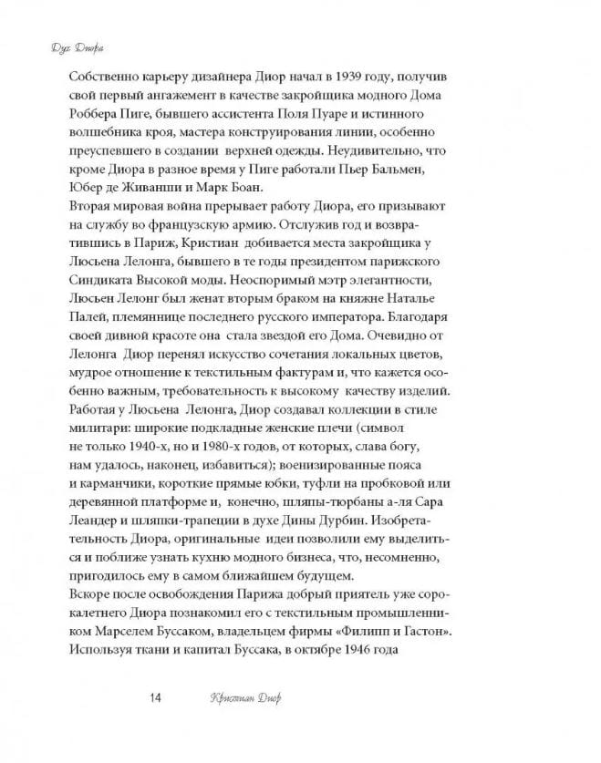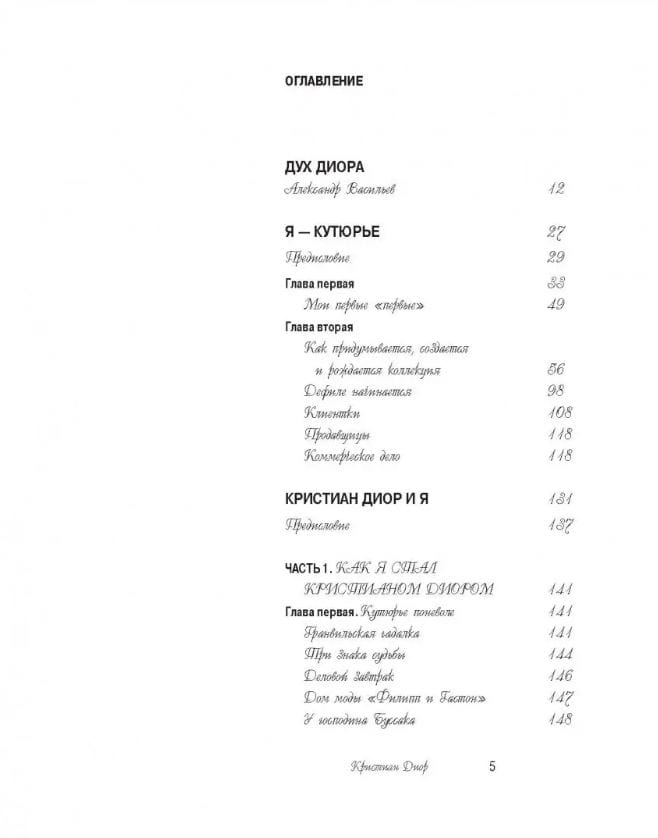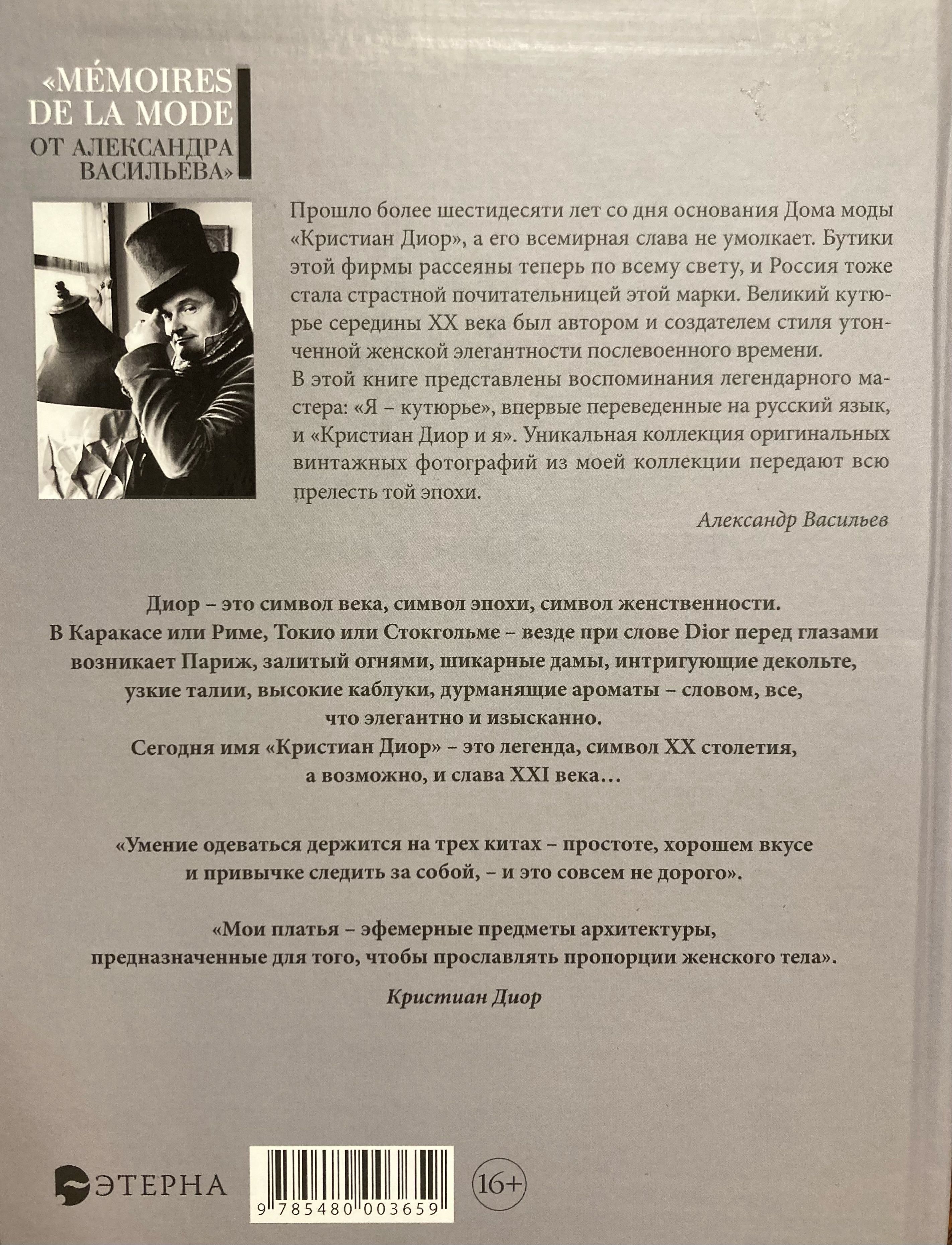 Kopš modes nama Christian Dior dibināšanas ir pagājuši vairāk nekā sešdesmit gadi, un tā slava visā pasaulē nemazinās. Šī uzņēmuma veikali tagad ir izkaisīti pa visu pasauli, un arī Krievija ir kļuvusi par kaislīgu šī zīmola cienītāju. 20. gadsimta vidus izcilais modes mākslinieks bija pēckara laika izsmalcinātās sievišķīgās elegances stila autors un radītājs. Par Dior ir izdotas daudzas grāmatas. Tomēr sērijas "Memoires de la mode" grāmatu atšķirīgā iezīme ir tās vai citas izcilas modes pasaules personības stāstījums pirmajā personā par sevi un savu darbu. Šajā grāmatā lasāmi leģendārā meistara memuāri: "Es esmu kurpnieks", kas pirmo reizi tulkots krievu valodā, un "Kristiāns Diors un es". Šajā izdevumā iekļauta unikāla oriģinālu senatnīgu fotogrāfiju kolekcija, kuras autors ir modes vēsturnieks Aleksandrs Vasiļjevs.