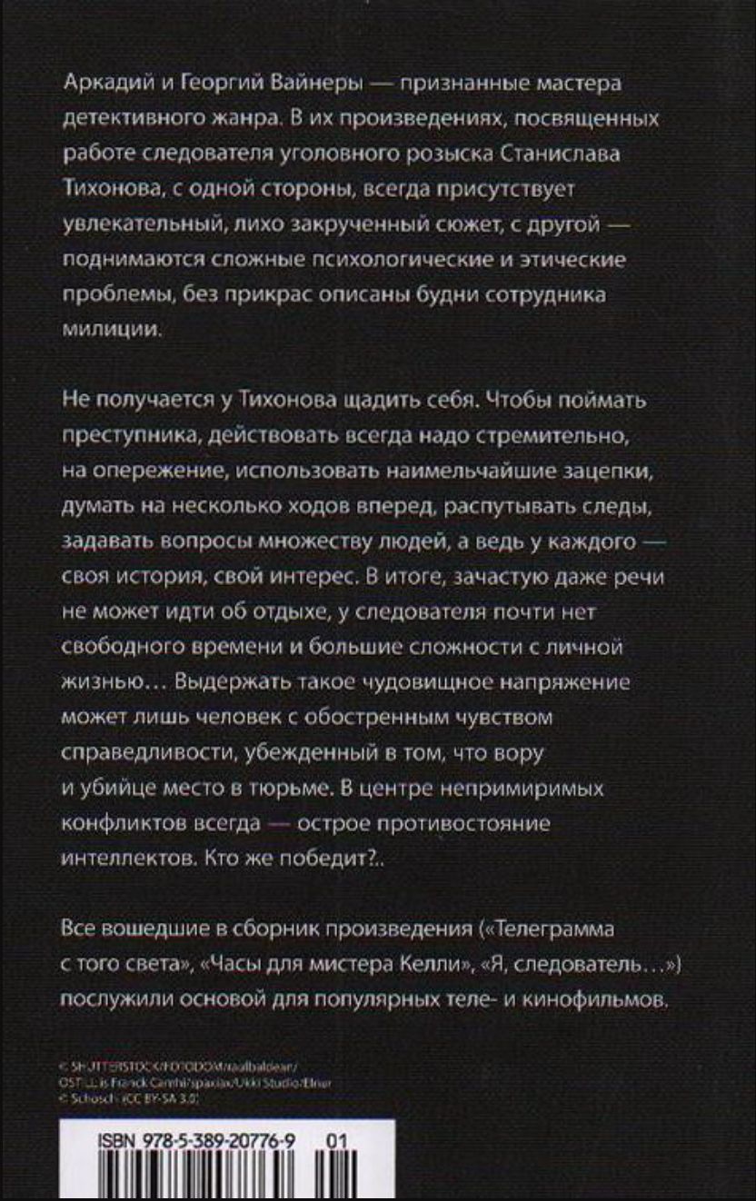 Arkādijs un Georgijs Vaineri ir atzīti detektīvžanra meistari. Viņu darbi, kas veltīti kriminālizmeklētāja Staņislava Tihonova darbam, vienmēr izceļas ar aizraujošu, sarežģītu sižetu, vienlaikus aktualizējot arī sarežģītus psiholoģiskus un ētiskus jautājumus, bez izskaistinājumiem attēlojot policista ikdienas dzīvi. Tihonovs nekad sevi nežēlo. Lai notvertu noziedznieku, vienmēr jārīkojas ātri, preventīvi, jāizmanto mazākās norādes, jādomā vairākus gājienus uz priekšu, jāatšķetina pēdas un jāaptaujā daudzi cilvēki, katram ar savu stāstu un interesēm. Tā rezultātā atpūta bieži vien nav iespējama; izmeklētājam gandrīz nav brīva laika, un viņš saskaras ar nopietnām grūtībām personīgajā dzīvē. Tikai cilvēks ar paaugstinātu taisnīguma izjūtu, pārliecināts, ka zagļiem un slepkavām vieta cietumā, spēj izturēt šādu milzīgu spriedzi. Visi krājumā iekļautie darbi ("Telegramma no citas pasaules", "Vērojums misteram Kellijam", "Es, izmeklētājs...") kalpoja par pamatu populārām televīzijas filmām un kinofilmām.