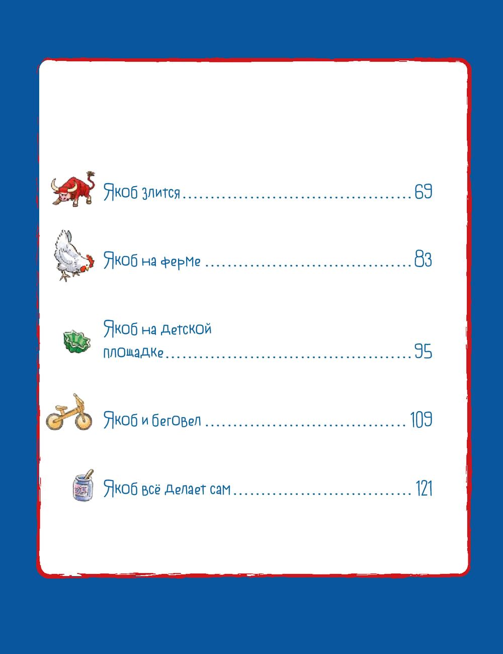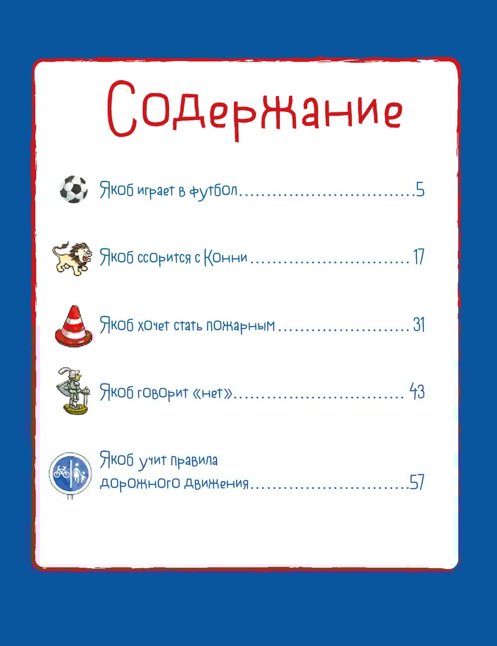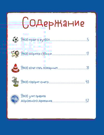 Krājumā iekļauti šādi stāsti: — Jēkabs spēlē futbolu; — Jēkabs cīnās ar Koniju; — Jēkabs saka "nē"; — Jēkabs mācās ceļu satiksmes noteikumus; — Jēkabs vēlas kļūt par ugunsdzēsēju; — Jēkabs dusmojas; — Jēkabs saimniecībā; — Jēkabs rotaļu laukumā; — Jēkabs un skrejceļš; — Jēkabs visu dara pats.