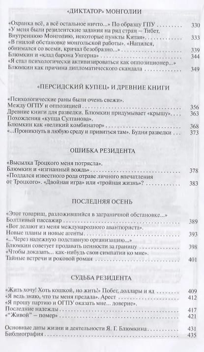 Blumkina citi neticamie piedzīvojumi un tēli — čekists, revolūcijas organizētājs Persijā, Mongolijas "diktators", barona Ungerna dārgumu meklētājs, militārais padomnieks Ķīnā, nelegāls padomju spiegs Tuvajos Austrumos, savas mīļotās nodevības upuris — tiek uztverti kā mitoloģija, kas radīta ar viņa paša līdzdalību. Tātad, kas viņš īsti bija — revolucionārs, piedzīvojumu meklētājs, izlūkdienestu aģents, provokators, slepenais aģents Trockim, kurš tika izsūtīts no PSRS?