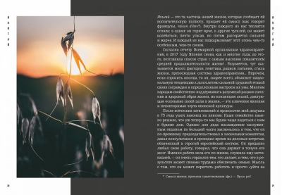 Nav jābūt dzimušam Japānā, lai atrastu savu ikigai (dzīves mērķi), atklātu īslaicīgā un nepabeigtā skaistumu (wabi-sabi), saskatītu skaistumu nepilnīgumā un godinātu grūtības un pārbaudījumus, kas atstāj iespaidu uz mums (kintsugi). Japāņi zina, kā apvienot miesas priekus un garīgās prakses, sākot no shinrin-yoku ("meža pirtis"), kaligrāfijas un ikebanas līdz tējas ceremonijai, mājas dizainam un īpašām attiecībām ar ēdienu. Šī grāmata palīdzēs jums kļūt apzinātākiem un laimīgākiem, ieviešot japāņu kultūras un pasaules uzskata elementus savā ikdienas dzīvē. Izdevumā ir daudz krāsainu fotogrāfiju un ilustrāciju, ko veidojis populārais mūsdienu japāņu mākslinieks Ryo Takemasa. "Es vēlos pamodināt jūsos vēlmi no jauna paskatīties uz savu dzīvi un bagātināt un izdaiļot to." (Erin Niimi Longhurst)