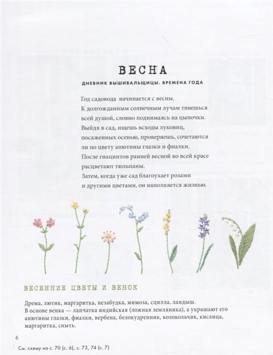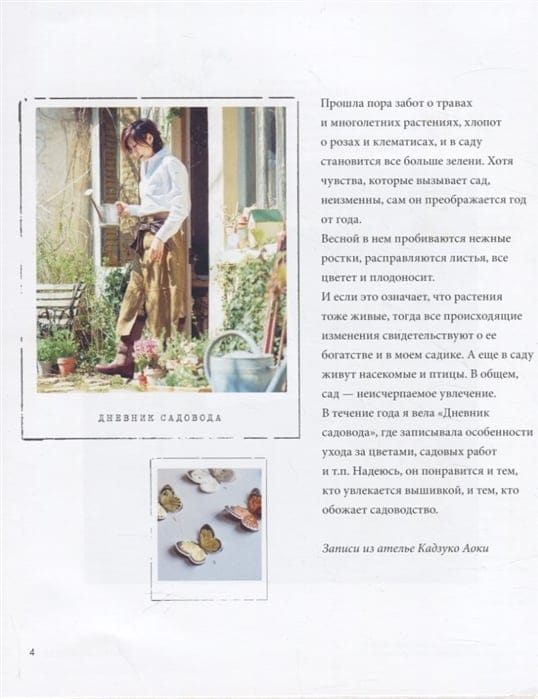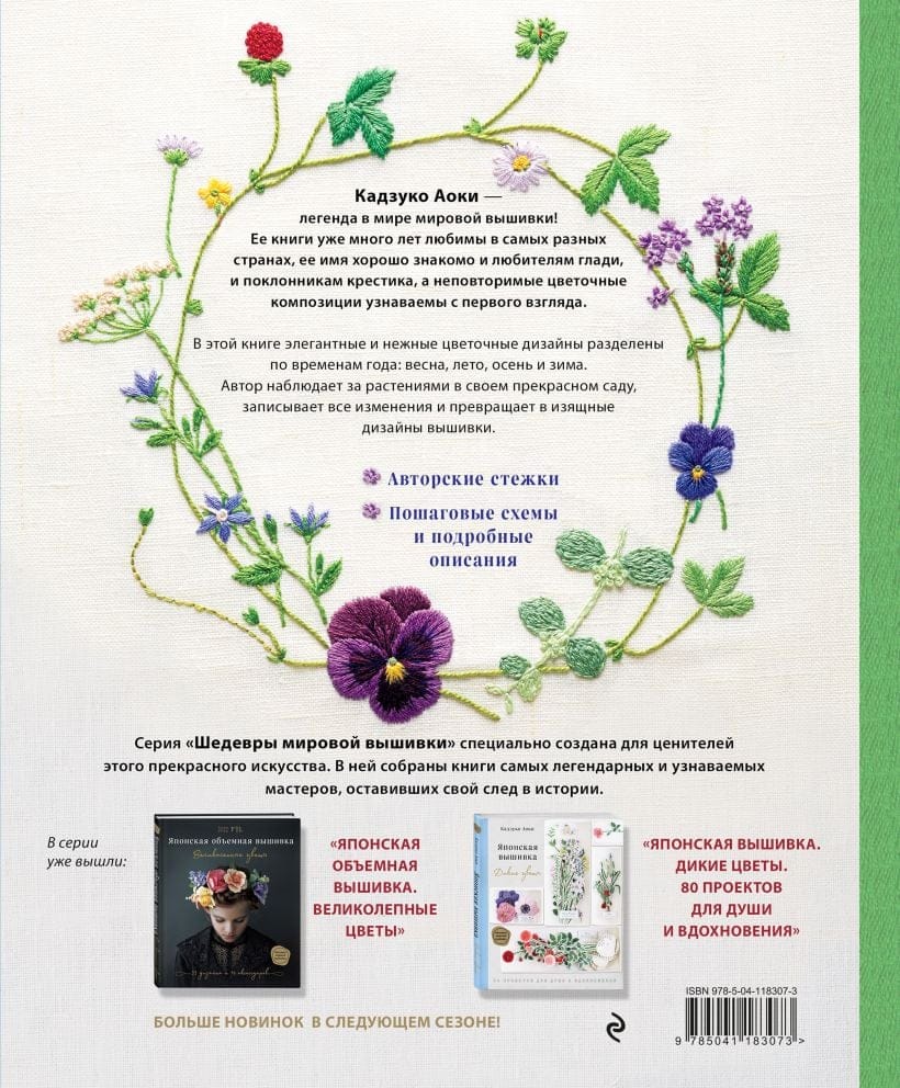 Pasaulslavenās japāņu izšuvējas Kazuko Aoki izšūšanas grāmata! Viņas vārds ir pazīstams gan dzijas, gan krustiņu cienītājiem, jo viņa ir visu roku meistare! Apbrīnojami smalkie un smalkie raksti ir viegli atpazīstami. Visas maigās zāles stiebriņi, smalkie pirmatnējie ziedi, savvaļas puķes ir darinātas ar lielu mīlestību un rūpību pret vissīkākajām detaļām. Elegantie un smalkie ziedu raksti ir sadalīti pa gadalaikiem: pavasaris, vasara, rudens un ziema. Autore vēro augus savā skaistajā dārzā, fiksē visas pārmaiņas un pārvērš tos elegantos izšūšanas rakstos. Šādi motīvi kļūs par brīnišķīgu dažādu priekšmetu - kreklu, T-kreklu, mugursomu un daudz kā cita - rotājumu!