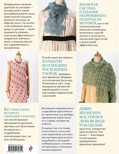 Šī laika gaitā pārbaudītā, skaistā un praktiskā rokasgrāmata piedāvā ne tikai 60 elegantus rakstus no labākajiem japāņu amatniekiem. Jūs atradīsiet arī daudz pārsteigumu: pieci skaisti modeļi skaidri demonstrē tehnikas praktisko pielietojumu, ērtas divkrāsu diagrammas, instrukcijas un visu sarežģīto detaļu skaidrojumus. Pat iesācēja ar to var tikt galā! Vairs nav nepieciešams izmantot adatu ilgāk nekā adāmadatas. Skaisti, loģiski, glīti – šis japāņu rokdarbnieču moto neprasa paskaidrojumus. Bet mēs piebilstam: vienkārši, tehnoloģiski attīstīti, iespaidīgi!
