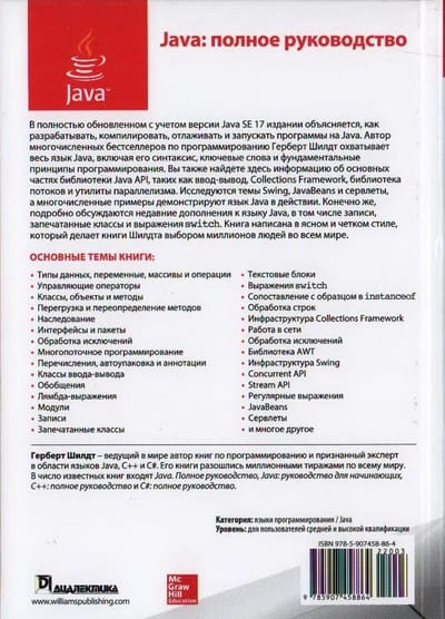 Šajā izdevumā, kas pilnībā atjaunināts, lai atspoguļotu Java SE 17, ir izskaidrots, kā izstrādāt, kompilēt, atkļūdot un palaist Java programmas. Herberts Šildts, daudzu programmēšanas bestselleru autors, aplūko visu Java valodu, tostarp tās sintaksi, atslēgvārdus un programmēšanas pamatprincipus. Jūs atradīsiet arī informāciju par galvenajām Java API bibliotēkas daļām, piemēram, I/O, Collections Framework, pavedienu bibliotēku un vienlaicības utilītprogrammām. Tiek aplūkotas tēmas par Swing, JavaBeans un servletiem, un daudz piemēru demonstrē Java valodu darbībā. Protams, ir sīki aplūkoti nesenie Java valodas papildinājumi, tostarp ieraksti, noslēgtās klases un komutatoru izteiksmes. Grāmata ir uzrakstīta skaidrā un kodolīgā stilā, kas padara Schildt grāmatas par miljoniem cilvēku visā pasaulē. Grāmata paredzēta programmētājiem, kuri vēlas apgūt Java valodu, un lietojumprogrammu izstrādātājiem, kuri vēlas uzlabot savas zināšanas un prasmes.