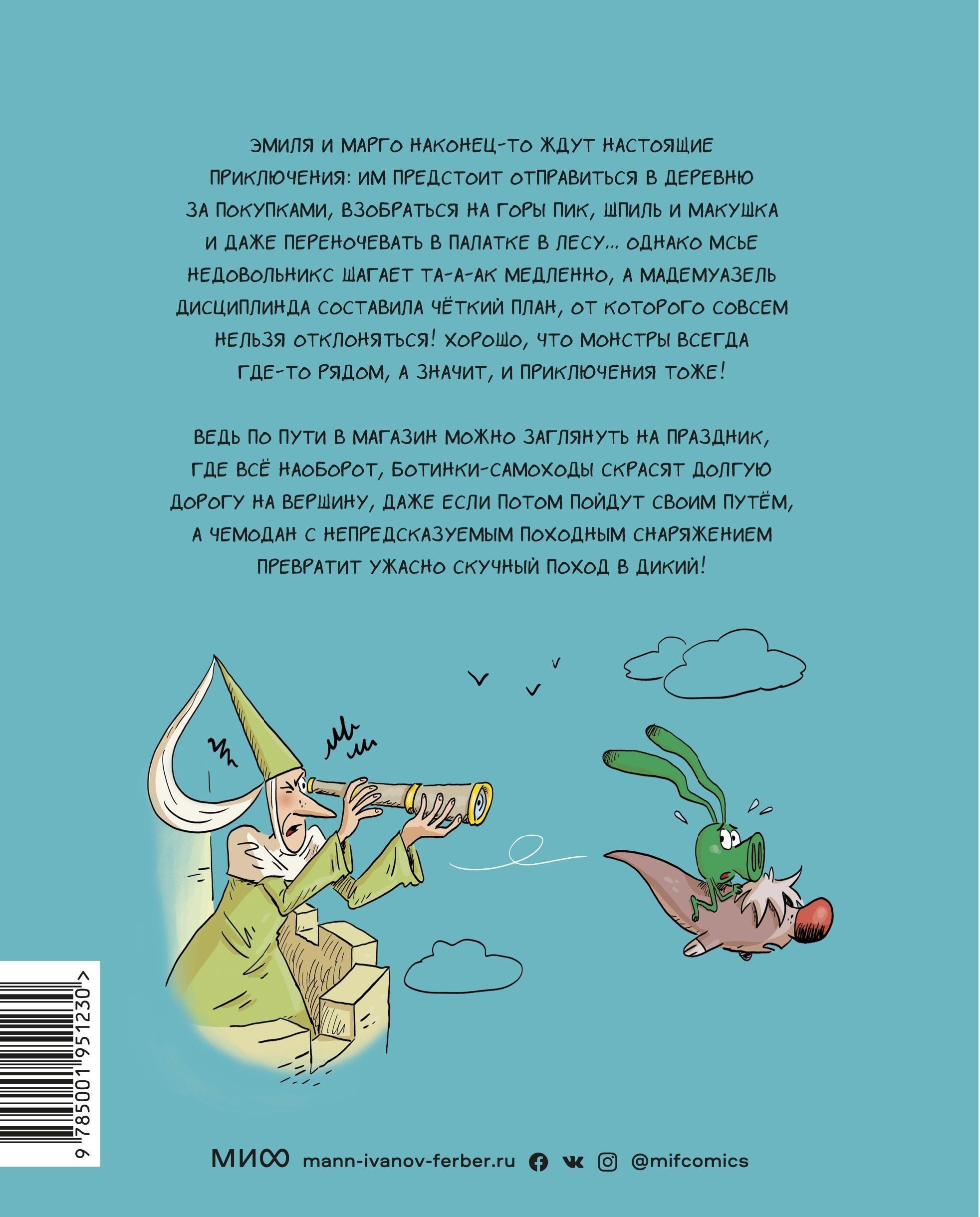 Jauna grāmata par Emīlu un Margotu un viņu briesmoņiem! Šajā daļā viņi gaida daudz piedzīvojumu un izklaides: pārgājienu uz Peak, Spire un Makushka kalniem visu dienu, nakšņošanu teltī mežā... Un monstriem palīdzēs veikt visus praktiķus un neļaus jums garlaicīgi!