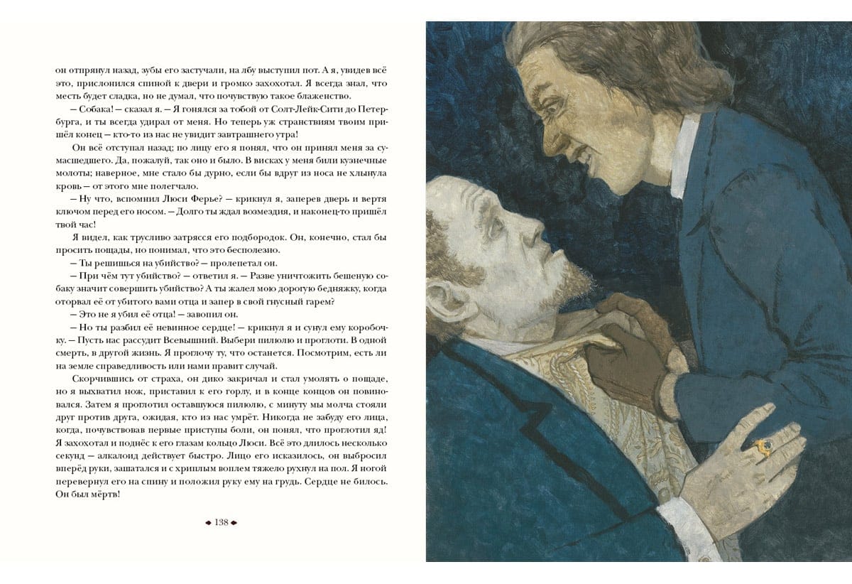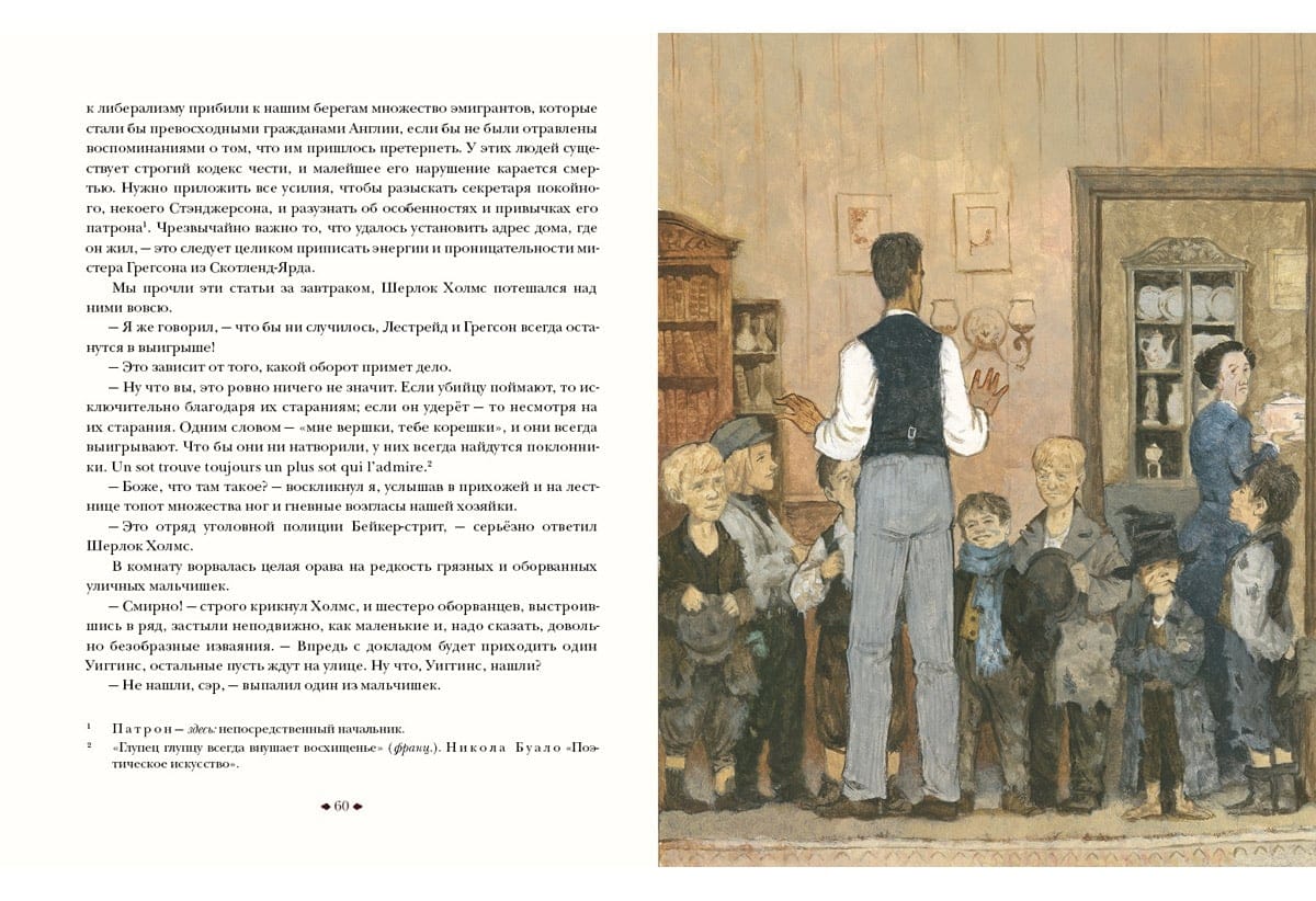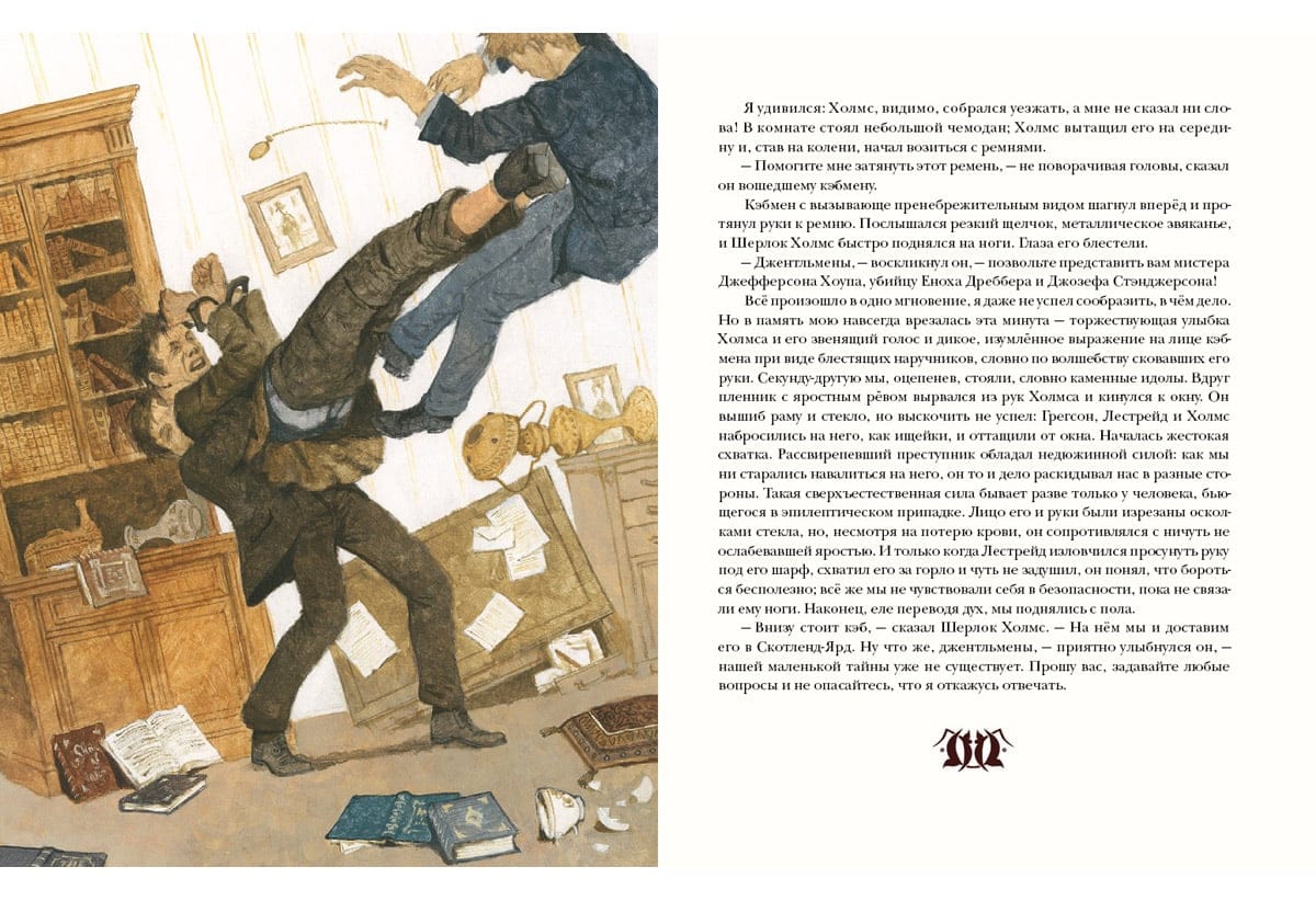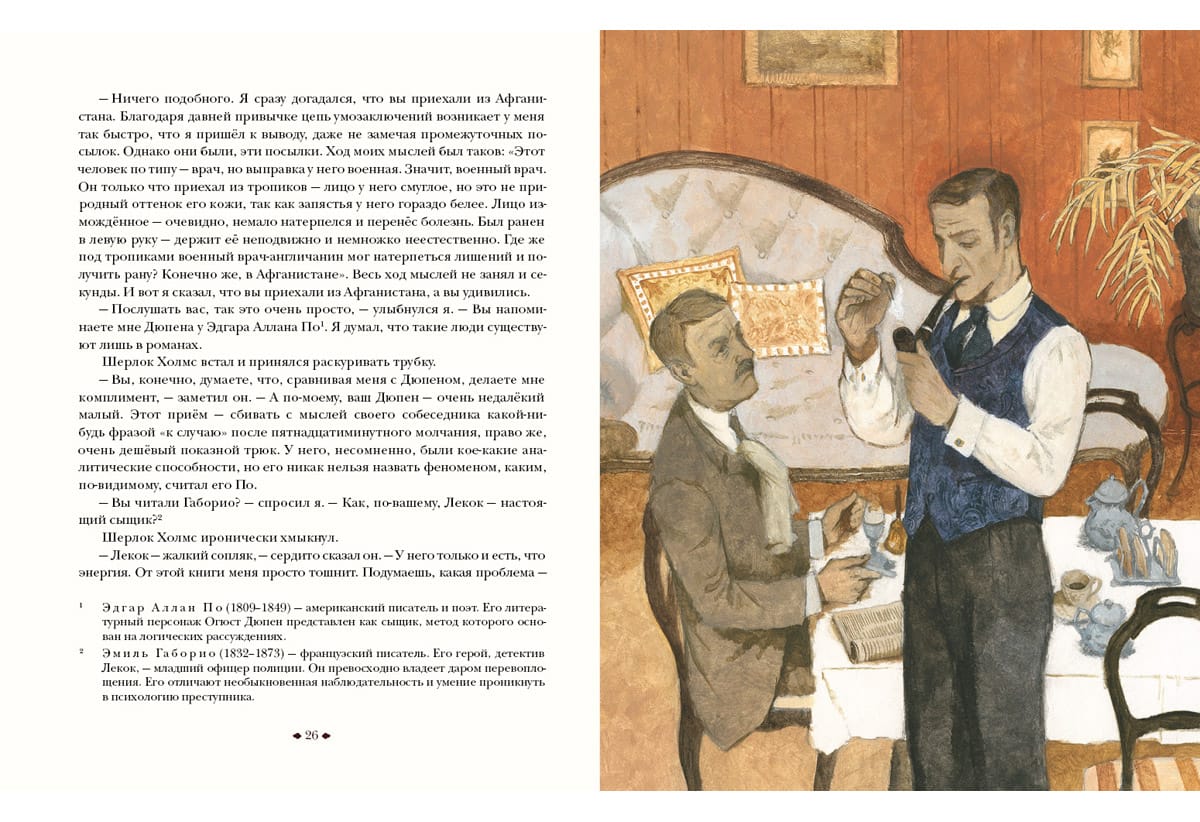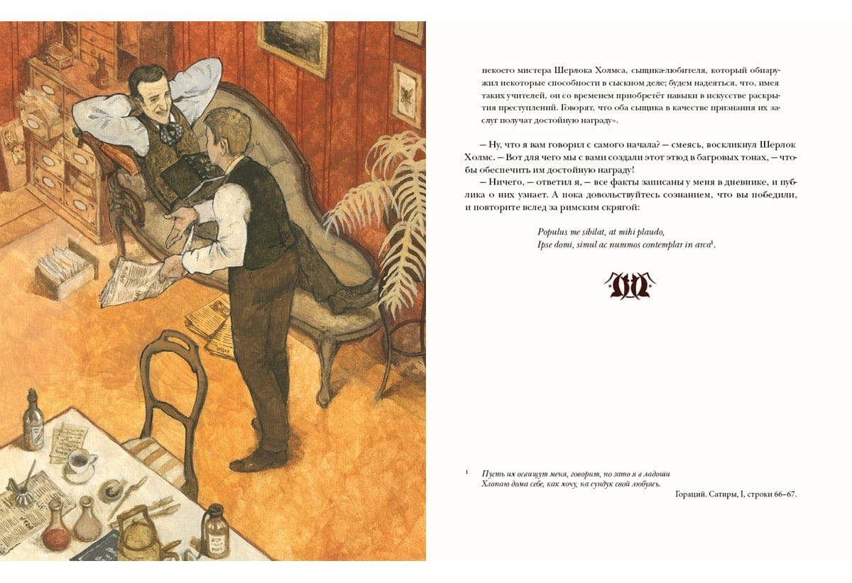 Artūrs Konans Doils ir autors miljoniem lasītāju iemīļotajiem romāniem un stāstiem par detektīvu Šerloku Holmsu un doktoru Džonu Vatsonu. "Pētījums purpura krāsā" - pirmais detektīvu cikla stāsts. Anglija, XIX gadsimts. Bijušais militārais ārsts Džons Vatsons, atvaļināts, atgriežas Londonā, kur satiek noslēpumaino Šerloka Holmsa kungu - lielisku noslēpumainu noziegumu izmeklēšanas speciālistu. Tā sākas viņu pirmais kopīgais gadījums. Viltīgais un asprātīgais Šerloks nojauš, kas slēpjas aiz slepkavības kādā pamestā mājā, un atrod vainīgo. Traģiskais stāsts aizved lasītāju uz Jūtas štatu savvaļas rietumos - īstu mormoņu cietoksni... Grāmatu ilustrējis mākslinieks Oļegs Pahomovs.