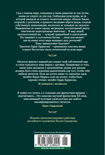 Sāga par Zemes pasauli, kas savā attīstībā ir izvēlējusies atšķirīgu ceļu no līdzšinējā. Globālā katastrofa, kuras rezultātā uz planētas iznīka milzu ķirzakas, ir apsteigusi Zemi, un rāpuļi, evolūcijas procesā ieguvuši saprātu, ir izveidojuši savu civilizāciju, kas nebūt nav līdzīga cilvēku civilizācijai. No sēklām izaugušas pilsētas, matriarhāts, kolektīvais intelekts, ģenētiski pārveidoti dzīvnieki... Un cilvēku pasaule, kas viņiem pretojas, ir sveša, naidīga un agresīva. Kas izdzīvos nemitīgajās cīņās - cilvēki vai iilāņi, kā šīs pasaules valodā sauc reptiļu rasi? Kam pieder nākotne? Harija Harisona triloģija ir atzīta žanra klasika, un tai ir neskaitāmi fani visā pasaulē. Šis izdevums ir ilustrēts ar britu mākslinieka Bila Sandersona mākslas darbiem.
