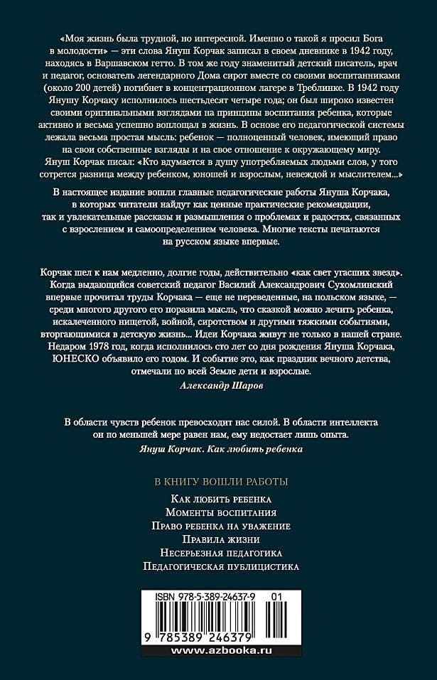 "Mana dzīve ir bijusi grūta, bet interesanta. Šos vārdus Janušs Korčaks 1942. gadā, atrodoties Varšavas geto, ierakstīja savā dienasgrāmatā. Tajā pašā gadā slavenais bērnu rakstnieks, ārsts un skolotājs, leģendārā Bāreņu nama dibinātājs, kopā ar saviem audzēkņiem (aptuveni 200 bērniem) gāja bojā Treblinkas koncentrācijas nometnē. 1942. gadā Janusz Korczak bija sešdesmit četri gadi; viņš bija plaši pazīstams ar saviem oriģinālajiem uzskatiem par bērnu audzināšanas principiem, kurus viņš aktīvi un ļoti veiksmīgi īstenoja praksē. Viņa pedagoģiskās sistēmas pamatā bija ļoti vienkārša ideja: bērns ir pilntiesīgs cilvēks, kuram ir tiesības uz saviem uzskatiem un attieksmi pret apkārtējo pasauli. Janušs Korčaks rakstīja: "Kas iedziļinās cilvēku lietoto vārdu dvēselē, tas izdzēsīs atšķirību starp bērnu, jaunieti un pieaugušo, nezinātāju un domātāju...". Šajā izdevumā iekļauti galvenie Januša Korčaka pedagoģiskie darbi, kuros lasītāji atradīs gan vērtīgus praktiskus ieteikumus, gan aizraujošus stāstus un pārdomas par problēmām un priekiem, kas saistīti ar cilvēka augšanu un pašnoteikšanos. Daudzi teksti krievu valodā tiek drukāti pirmo reizi.