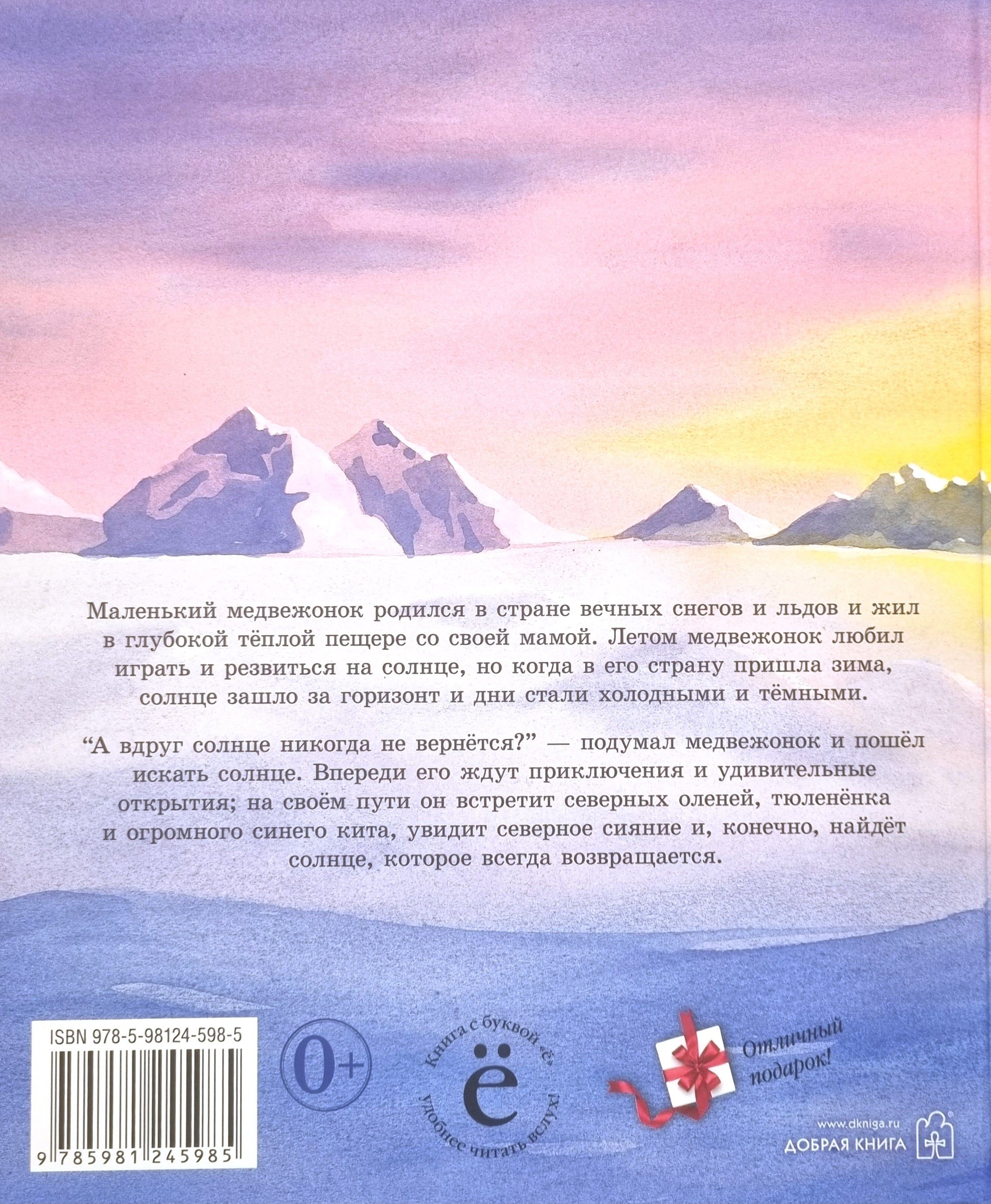 “Kas notiks, ja saule nekad neatgriezīsies?” nodomāja lācēns un devās meklēt sauli. Viņu gaida piedzīvojumi un pārsteidzoši atklājumi; ceļā viņš satiks ziemeļbriežus, roņu mazuļus un milzīgu zilo vali, redzēs ziemeļblāzmu un, protams, atradīs sauli, kas vienmēr atgriežas.