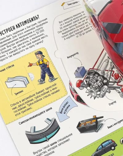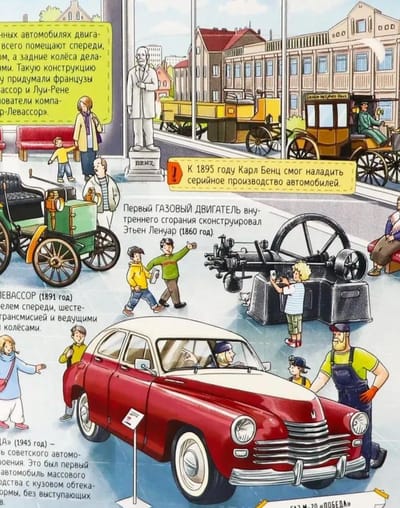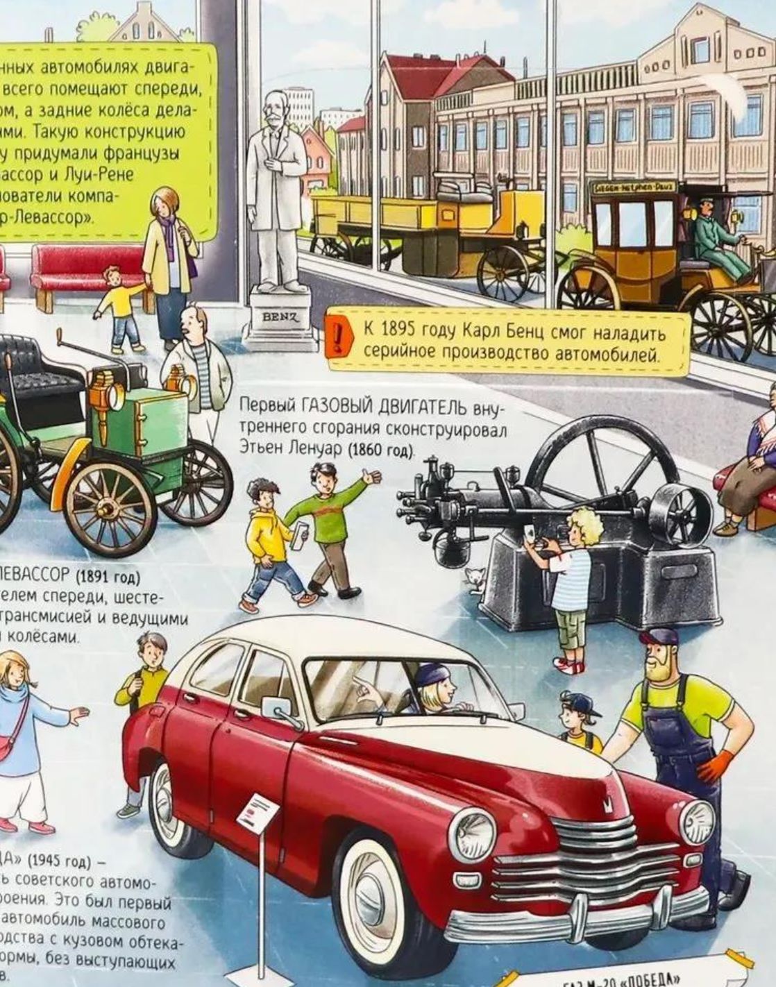 Detalizētas, krāsainas ilustrācijas un dažādu formu logi ļaus jūsu bērnam izpētīt automašīnu montāžas posmus, apskatīt pirmās automašīnas tā, it kā tās atrastos īstā muzejā, un uzzināt daudz citas interesantas un noderīgas informācijas.