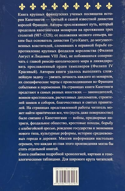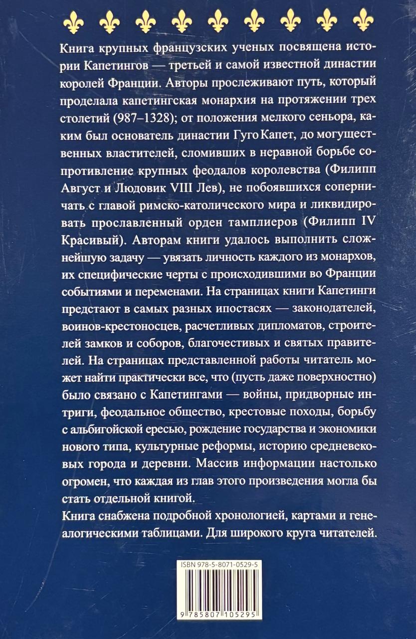 Kapetingu dinastijas vēsture ir nesaraujami saistīta ar Francijas vēsturi. Šīs grāmatas autori raksta ne tikai par pašiem karaļiem, bet arī iegremdē lasītāju Francijas viduslaiku pasaulē – krusta karu, plaukstošu pilsētu, gotisku katedrāļu un 12. un 13. gadsimta kultūras atdzimšanas pasaulē.