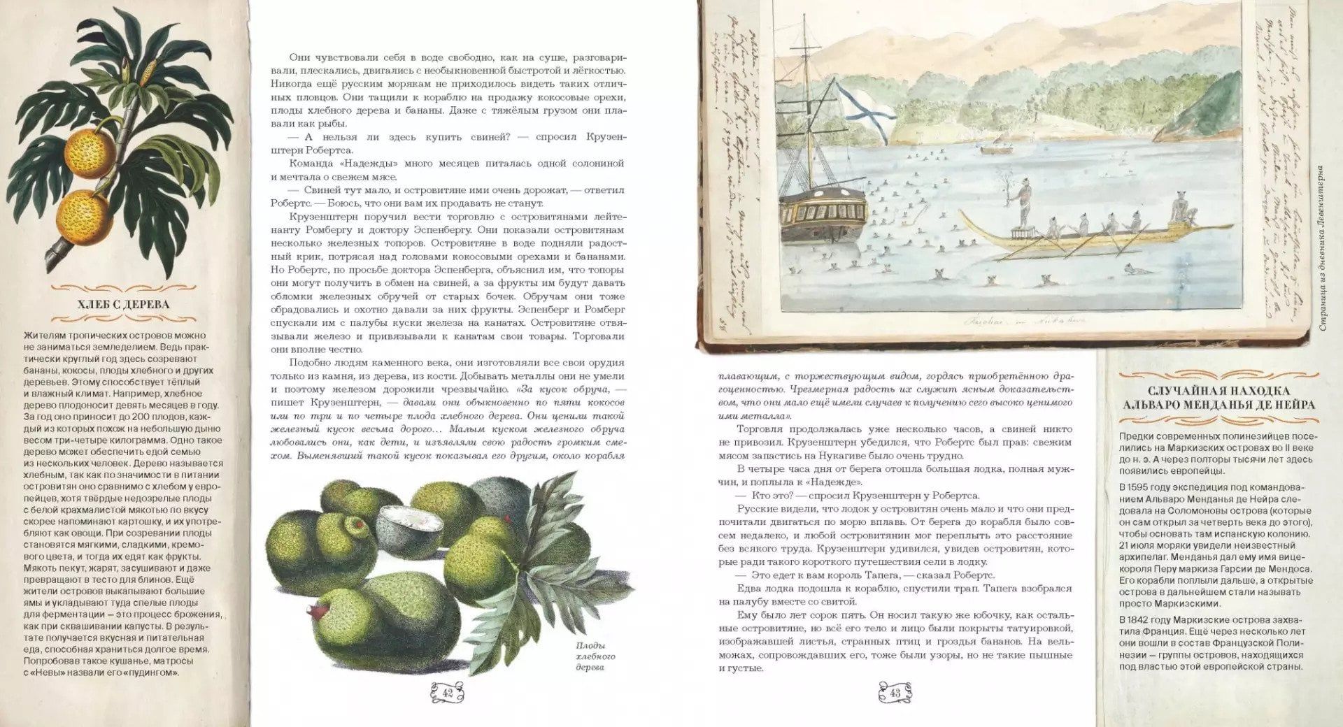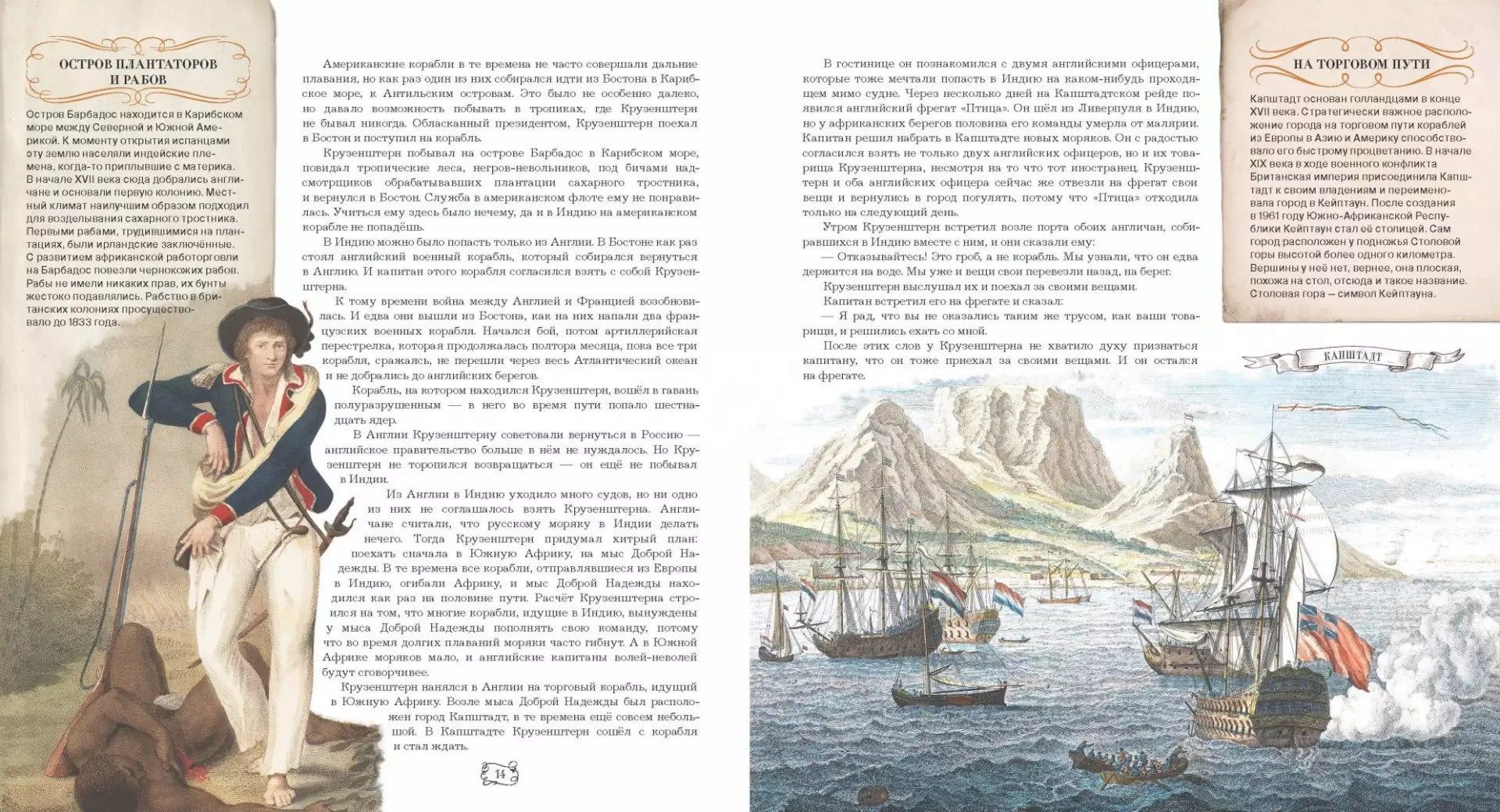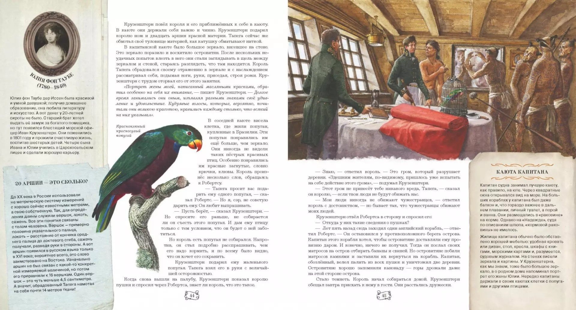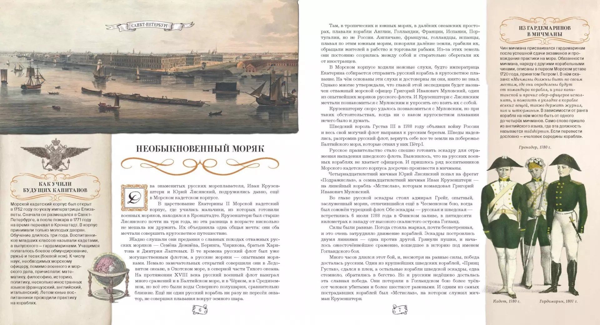 Šī grāmata stāsta par pirmo Krievijas aplidošanu apkārt zemeslodei, ko veica Ivans Krusensterns un Jurijs Lisjanskis. Lasītāji kopā ar drosmīgajiem jaunajiem virsniekiem un viņu apkalpi veiks visu ceļu, atklās tālas zemes un iepazīs kuģniecības vēsturi. Komentāri stāstīs par slaveniem ceļojumiem un ceļotājiem, Krievijas jūras kara flotes vēsturi, dažādu tautu dzīvi un tradīcijām, par dzīvniekiem un dabu tālākajos pasaules nostūros. Grāmatas malās apkopotas navigatoru piezīmes un skices, kartes, shēmas un retas gravīras. Pārvietojamie elementi ļaus aplūkot kuģi no iekšpuses, ielūkoties ķīniešu mājā un justies kā īstiem atklājējiem. Kam tā patiks: ikvienam, kurš sapņo par ceļojumiem un neticamiem atklājumiem, sajūsminās par buru kuģiem un bezgalīgām jūrām, mīl uzzināt ko jaunu par pasauli un aplūkot krāsainas grāmatas.