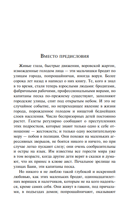 "Smilšu kapteiņi nav kā citi bērni... Viņi zina visu par dzīvi, pat mīlestības noslēpumus... Kopš bērnības viņi ir dzīvojuši pieaugušu vīriešu dzīvi." Viņi ir sociālās netaisnības upuri, un tomēr viņi ir vienīgie patiesi brīvie cilvēki pasaulē.
