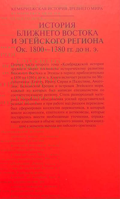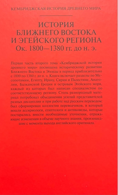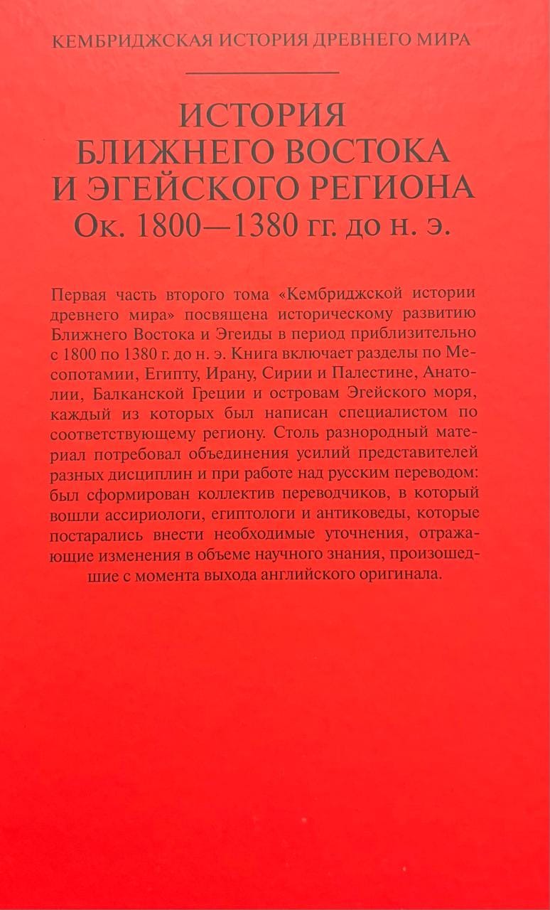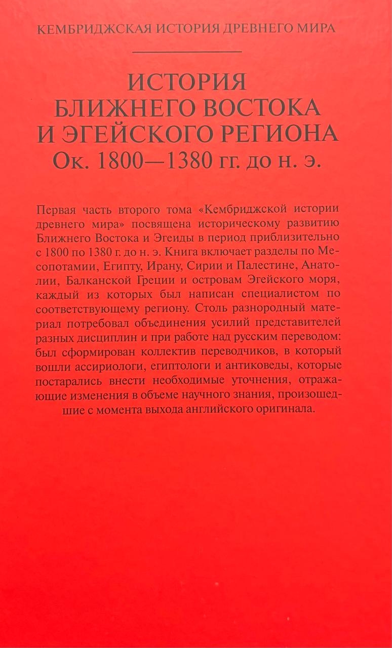 Grāmatas “Kembridžas senā vēsture” otrā sējuma pirmā daļa ir veltīta Tuvo Austrumu un Egejas jūras vēsturiskajai attīstībai aptuveni no 1800. līdz 1380. gadam p.m.ē. Grāmatā ir iekļautas sadaļas par Mezopotāmiju, Ēģipti, Irānu, Sīriju un Palestīnu, Anatoliju, Balkānu Grieķiju un Egejas jūras salām, un katru no tām ir sarakstījis attiecīgā reģiona speciālists. Šāda daudzveidīga materiāla tulkošanai krievu valodā bija nepieciešami dažādu disciplīnu pārstāvju kopīgi centieni: tika izveidota tulkotāju komanda, kurā bija asirologi, ēģiptologi un klasiķi, kuri centās ieviest nepieciešamos skaidrojumus, atspoguļojot zinātnisko zināšanu izmaiņas, kas notikušas kopš angļu oriģināla publicēšanas.