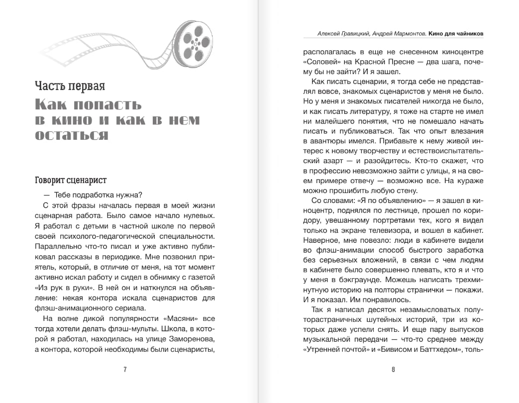 "Kino iesācējiem" ir praktisks un asprātīgs ceļvedis tiem, kas vēlas iekļūt kino industrijā. Scenārists Aleksejs Gravickis un režisors Andrejs Marmontovs dalās savā personīgajā pieredzē, atklājot profesijas noslēpumus: kā uzsākt karjeru, izvairīties no kļūdām, sadarboties ar producentiem un neļaut scenārijam sabojāties.
