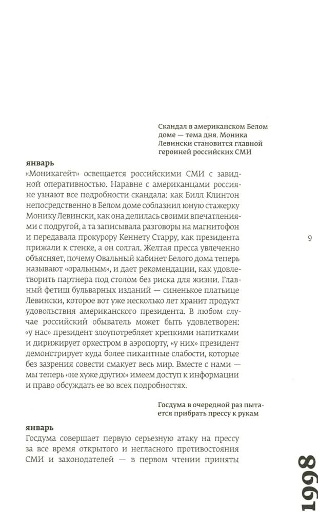 20. gadsimts beidzas: "Sveikas, margrietiņas!", augusta noklusējuma datums, daudzdzīvokļu māju sprādzieni, Puškina divsimtgade, "Cik burvīgi ir vakari Krievijā" un "Jo tu nevari...", "Vīrs, kas izskatās pēc ģenerālprokurora", "Salauztu lukturu ielas", Erasta Fandorina piedzīvojumi, Umberto Eko Maskavā, "Hrustaļev, mana mašīna!" Kannās, Ralfs Fainss Oņegina lomā, skinhedi, grupa "Ļeņingrad", Deniss Macujevs, Todorovska "Nedzirdīgo zeme", karaliskās ģimenes bēres, zemūdenes "Kursk" bojāeja, ugunsgrēks Ostankinas televīzijas tornī, Lucika "Nomales", Černomirdins - Kirijenko, Balabanova "Par ķēmjiem un cilvēkiem", Kirijenko - Primakovs, Sokurova "Moločs", Primakovs - Stepašins, Mihalkova "Sibīrijas bārddzinis", Stepašins - Putins, NATO bombardē Dienvidslāviju, atgriežas padomju himna, Šahnazarovs vada Mosfilm, The Rolling Stones Lužņikos, "Karalis un jokdaris Jubileinijā", P paaudze, MTV, IKEA, "Kino bez robežām", "Naše Radio", LiveJournal, Goskino likvidēšana, otrās Čečenijas kampaņas sākums, Jeļcina atkāpšanās, Putina ievēlēšana, grupa "Tatu" izdod savu pirmo albumu, Danila Bagrovs dodas uz ASV - noslēguma sējums stāsta par filmām, parādībām un 1998.–2000. gada notikumi.