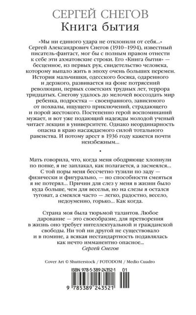 "Mēs paši no sevis neesam atvairījuši nevienu triecienu…" - ar šīm Ahmatovam raksturīgajām rindām par sevi pamatoti varētu teikt slavenais daiļliteratūras rakstnieks Sergejs Aleksandrovičs Sņegovs (1910-1994). Viņa "Esības grāmata" ir nenovērtējama, no pirmavota iegūta liecība par cilvēku, kuram nācās dzīvot ļoti lielu pārmaiņu laikmetā. Stāsts par zēnu, Odesas bosjaku, apdāvinātu un drosmīgu, attīstās uz revolūcijas satricinājumu, pirmo padomju smago gadu, trīsdesmito gadu terora fona. Sņegovam izdevies atveidot bērna, pusaudža pasauli - nepakļāvīgu, atkarīgu no uzslavām, meklējošu piedzīvojumus, ciešanu un dažkārt nežēlīgu. Pamazām memuāru varonis muzhivaetsya, un šeit jau ir daudzsološs jaunais zinātnieks lekcijas universitātē. Tomēr netradicionālisms ir bīstams pilnīgas vienlīdzības zemē, kas uzspiesta ar varu. Un tāpēc viņa arests 1936. gadā šķiet gandrīz neizbēgams.