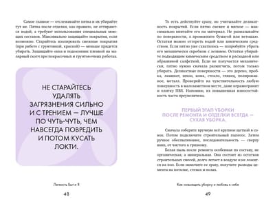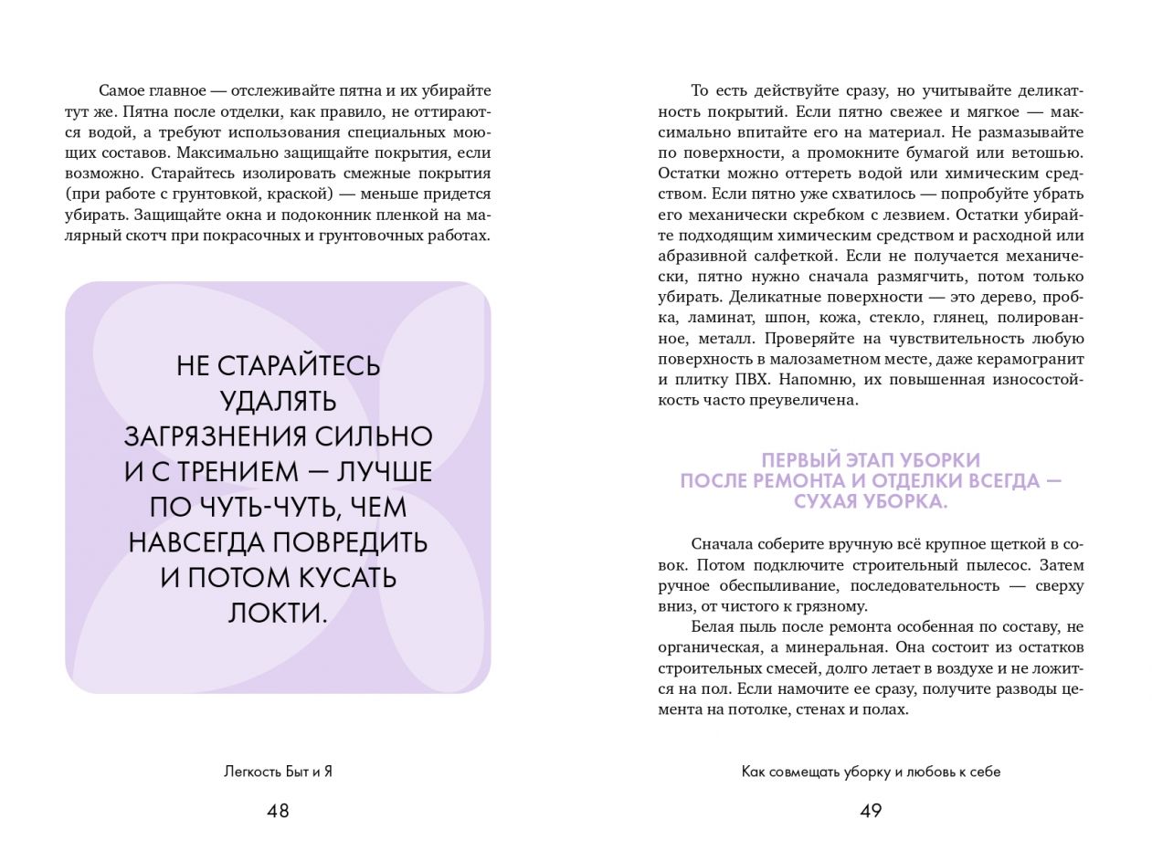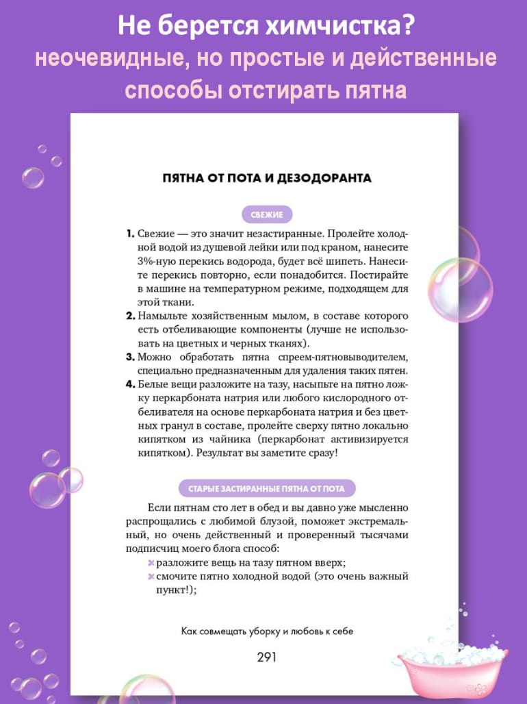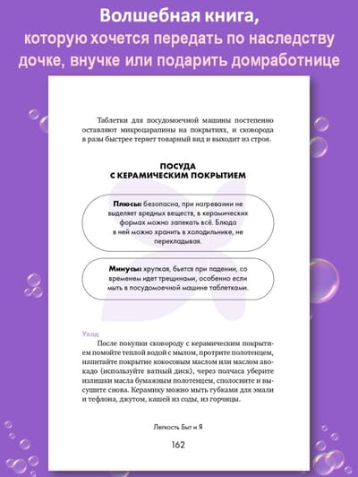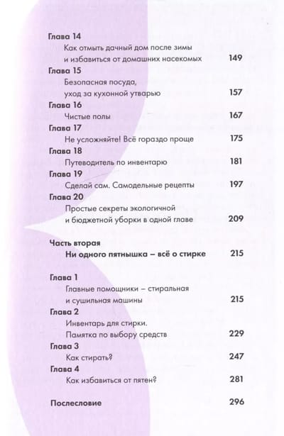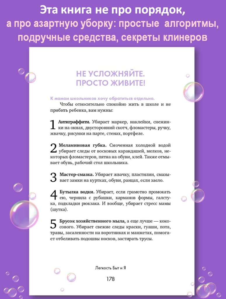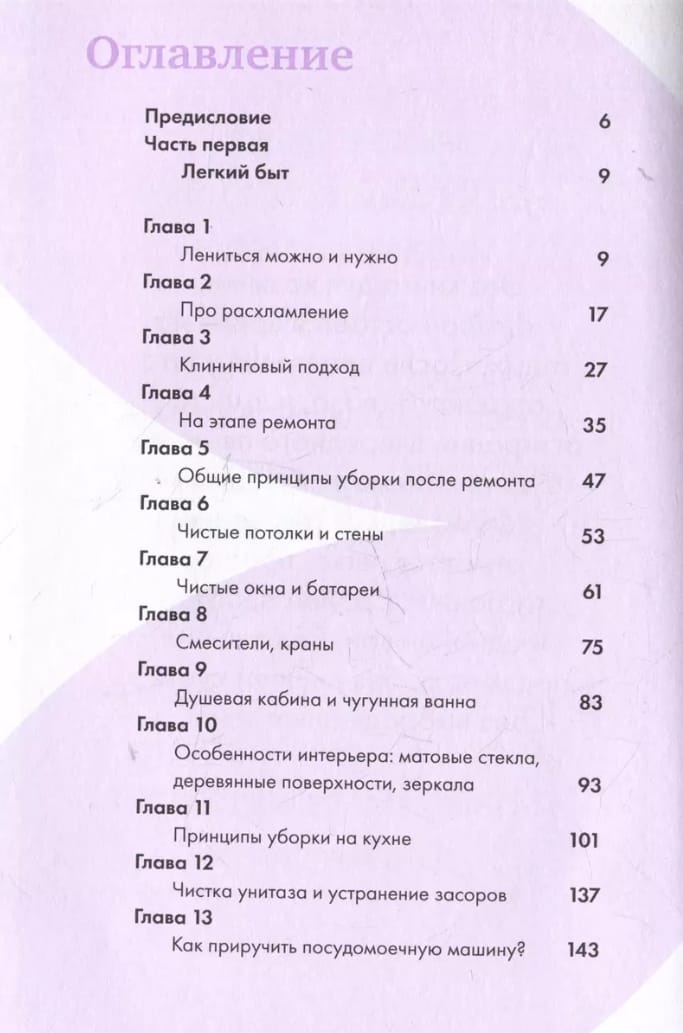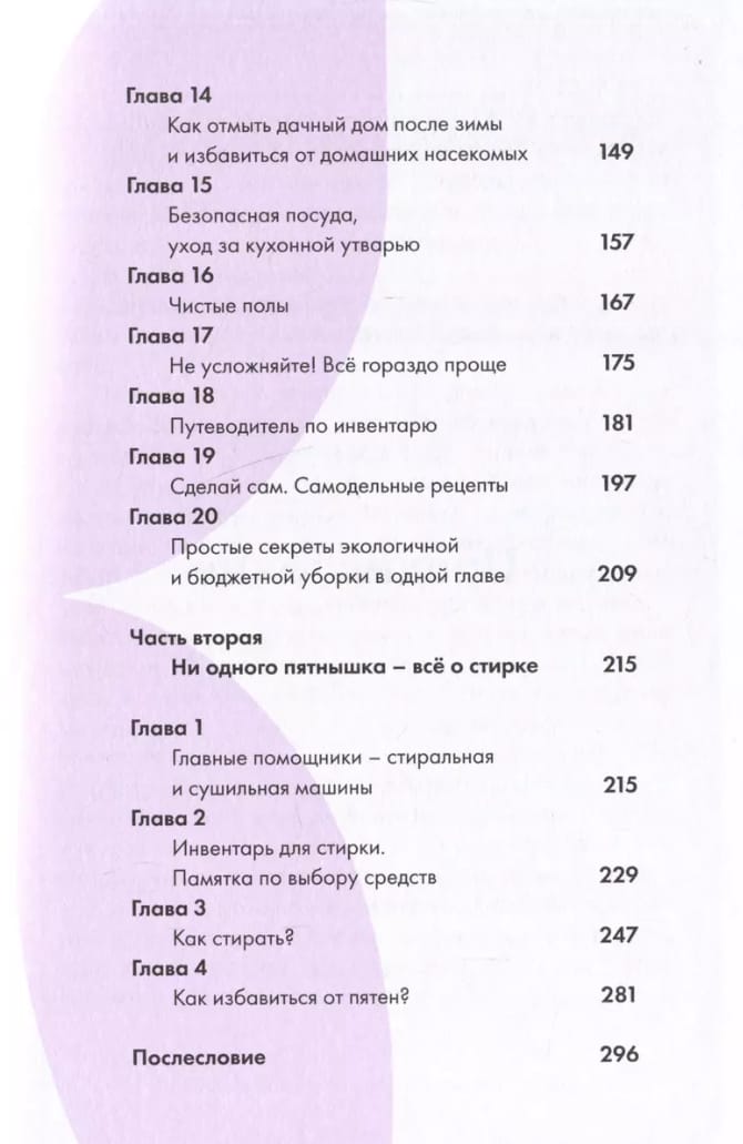 Tīrīšanas eksperte #1 Krievijā ar 20 gadu pieredzi, populārā emuāra aida_prodom autore Aīda Siņicina dalās ar profesionāliem padomiem, lai jūs prasmīgi un bez piepūles, vienlaikus arī videi draudzīgi varētu vadīt savu mājsaimniecību. Jūs uzzināsit pēc iespējas vairāk par budžetam draudzīgiem rīkiem. Piemēram, kā ar vienkāršu verdošu ūdeni noņemt ogu traipus no T-krekliem, traipus uz baltām mēbelēm un grīdlīstes ar skolas dzēšgumiju un lipīgos slāņus uz sadzīves tehnikas un logu rāmjiem ar apelsīnu ēterisko eļļu; kā atjaunot tills tā sniegbalto izskatu, izmantojot cepamo sodu; Kā tīrīt jaucējkrānus, krānus un izlietnes, izmantojot tikai citrona šķēli. Un daudzi citi padomi vieglai, bez stresa dzīvei. Autore ir pārliecināta, ka mājas uzkopšana var būt aizraujošs, patīkams process, kas neprasa ne daudz laika, ne naudas. Grāmata noderēs ikvienam, kam patīk (un ne tik ļoti) tīrīt un sakārtot savu dzīvokli.
