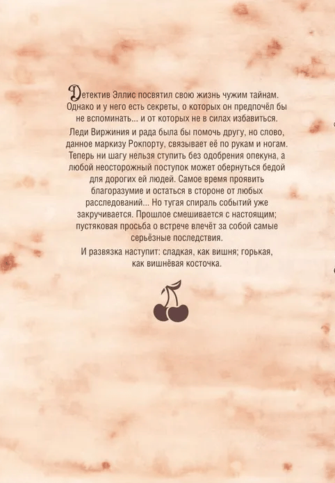 Lēdija Virdžīnija labprāt palīdzētu savai draudzenei, taču viņu saista dotais vārds marķīzam Rokportam. Tagad viņa nevar spert ne soli bez sava aizbildņa piekrišanas, un jebkura neuzmanīga rīcība var pārvērsties katastrofā cilvēkiem, kas viņai rūp. Ir pienācis laiks būt piesardzīgai un turēties tālāk no jebkādām izmeklēšanām… Taču saspringtā notikumu spirāle jau griežas. Pagātne sajaucas ar tagadni; nenozīmīgam lūgumam tikties ir visnopietnākās sekas. Un tuvojas atrisinājums: salds kā ķirsis; rūgts kā ķirša kauliņš.