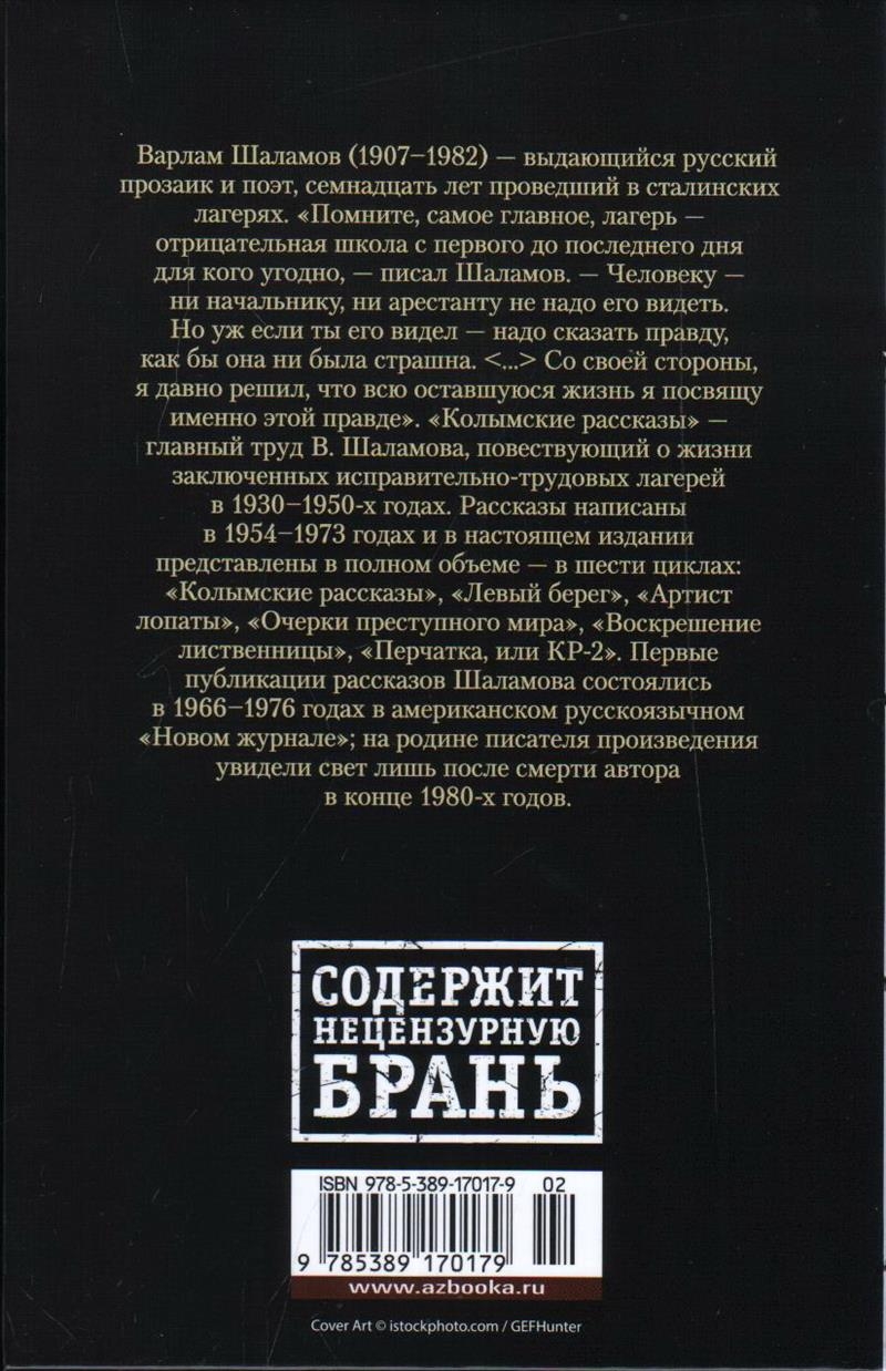 Varlams Šalamovs (1907-1982) bija izcils krievu prozaiķis un dzejnieks, kurš septiņpadsmit gadus pavadīja Staļina nometnēs. "Atcerieties, pats galvenais, ka nometne ikvienam ir negatīva skola no pirmās līdz pēdējai dienai," rakstīja Šalamovs. - Cilvēkam - ne priekšniekam, ne ieslodzītajam - tas nav jāredz. Bet, ja esi to redzējis - ir jāstāsta patiesība, lai cik briesmīga tā arī nebūtu. Es no savas puses jau sen nolēmu, ka veltīšu visu atlikušo dzīvi šai patiesībai. "Kolimas stāsti" - galvenais V. Šaļamova, kas stāsta par darba nometņu ieslodzīto dzīvi 1930.-1950. gadā. Stāsti sarakstīti 1954-1973. gadā un šajā izdevumā ir pārstāvēti pilnībā - sešos ciklos: "Kolimas stāsti", "Kreisais krasts", "Lāpstas mākslinieks", "Pazemes pasaules skices", "Lāčplēša augšāmcelšanās", "Cimds jeb KR-2". Pirmie Šaļamova stāsti tika publicēti 1966.-1976. gadā Amerikas krievvalodīgajā izdevumā "Novij Žurnal", rakstnieka dzimtenē darbi dienas gaismu ieraudzīja tikai pēc autora nāves 80. gadu beigās.