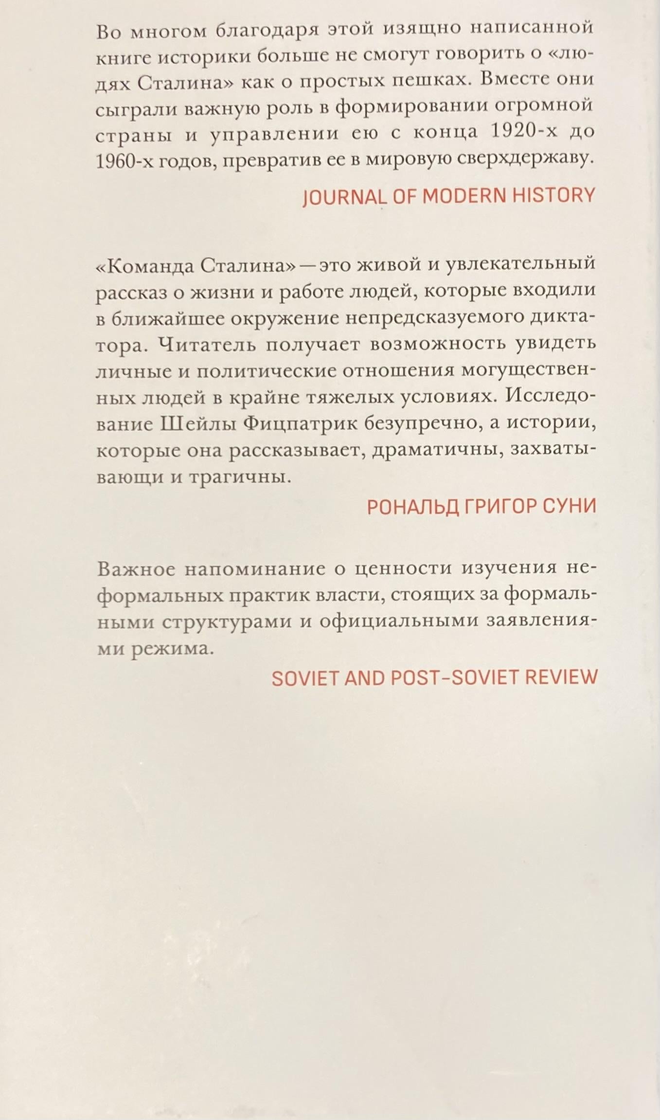 Staļins bija diktators tik ilgi, ka lielākā daļa vēsturnieku ir uzskatījuši, ka amatpersonas ap viņu bija tikai samierinātāji un politiskās pieklājības elementi. Šī grāmata apstrīd šo viedokli, parādot, ka aiz Staļina stāvēja lojālistu grupa, kas kopā ar viņu veidoja neparasti efektīvu komandu no 20. gadu beigām līdz pat viņa nāvei 1953. gadā. Pamatojoties uz plašu oriģinālu pētījumu, Šeila Ficpatrika pirmo reizi piedāvā detalizētu aprakstu par šī iekšējā loka locekļiem un viņu ģimenēm. Viņa parāda, ka šie lojālie līdzgaitnieki - Berija, Andrejevs, Hruščovs - ne tikai cieši sadarbojās ar Staļinu, bet arī veidoja viņa sociālo loku. Grāmata, kas lasītājus aizved no Lielās tīrīšanas un Otrā pasaules kara kataklizmām līdz Staļina pēdējo gadu paranojai, atklāj pilnīgi jaunu Staļina iekšējā loka portretu, mainot mūsu izpratni par to, kā Padomju Savienība tika pārvaldīta lielāko daļu tās pastāvēšanas laika.