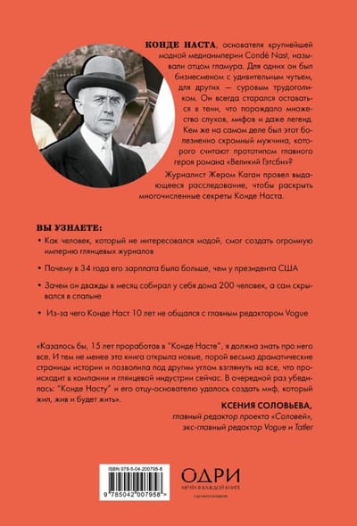 Šī grāmata stāsta par Condé Nast, lielākās modes mediju impērijas Condé Nast dibinātāja, dzīvi un neticamajiem panākumiem. Dažiem viņš bija biznesmenis ar pārsteidzošām instinktiem, citiem - stingrs darbaholiķis. Kondē vienmēr centās palikt ēnā, kas radīja daudzas baumas, mītus un pat leģendas. Kas īsti bija šis sāpīgi pieticīgais vīrietis, kurš tiek uzskatīts par romāna "Lielais Getsbijs" galvenā varoņa prototipu?