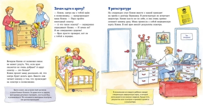 Ja jūs iepriekš sagatavojat savu bērnu ceļojumam uz klīniku, ārsta apmeklējums var notikt diezgan gludi. Piemēram, Konija nebaidās doties pie ārsta. Mamma viņai izskaidroja, kāpēc viņai ir jāiet pie ārsta, un tagad Konija zina, ka tas nemaz nav biedējoši! Kopā ar Koniju bērns pārstās baidīties no ārstiem un iepazīsies ar dažādām medicīnas ierīcēm. Un grāmatā ar logiem var atvērt jebkura kabineta durvis un pat apskatīt, kas ir ārsta atvilktnēs!