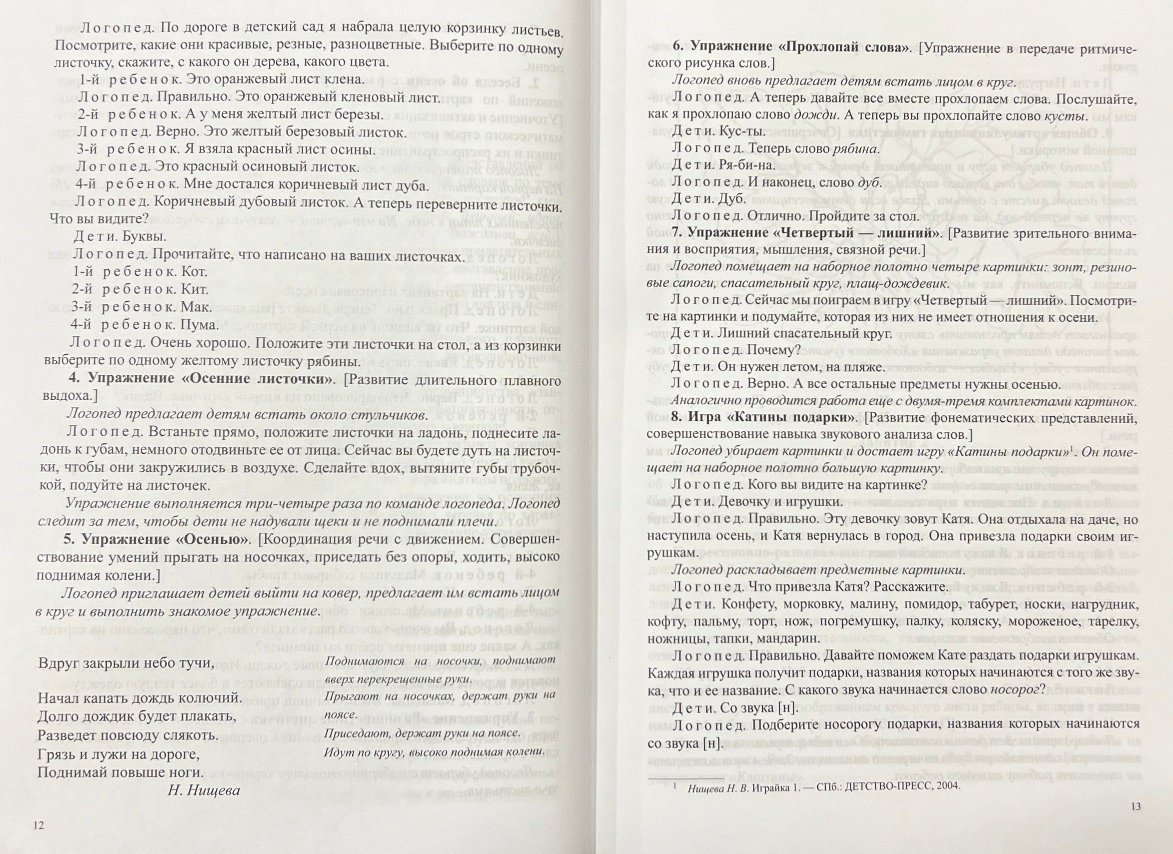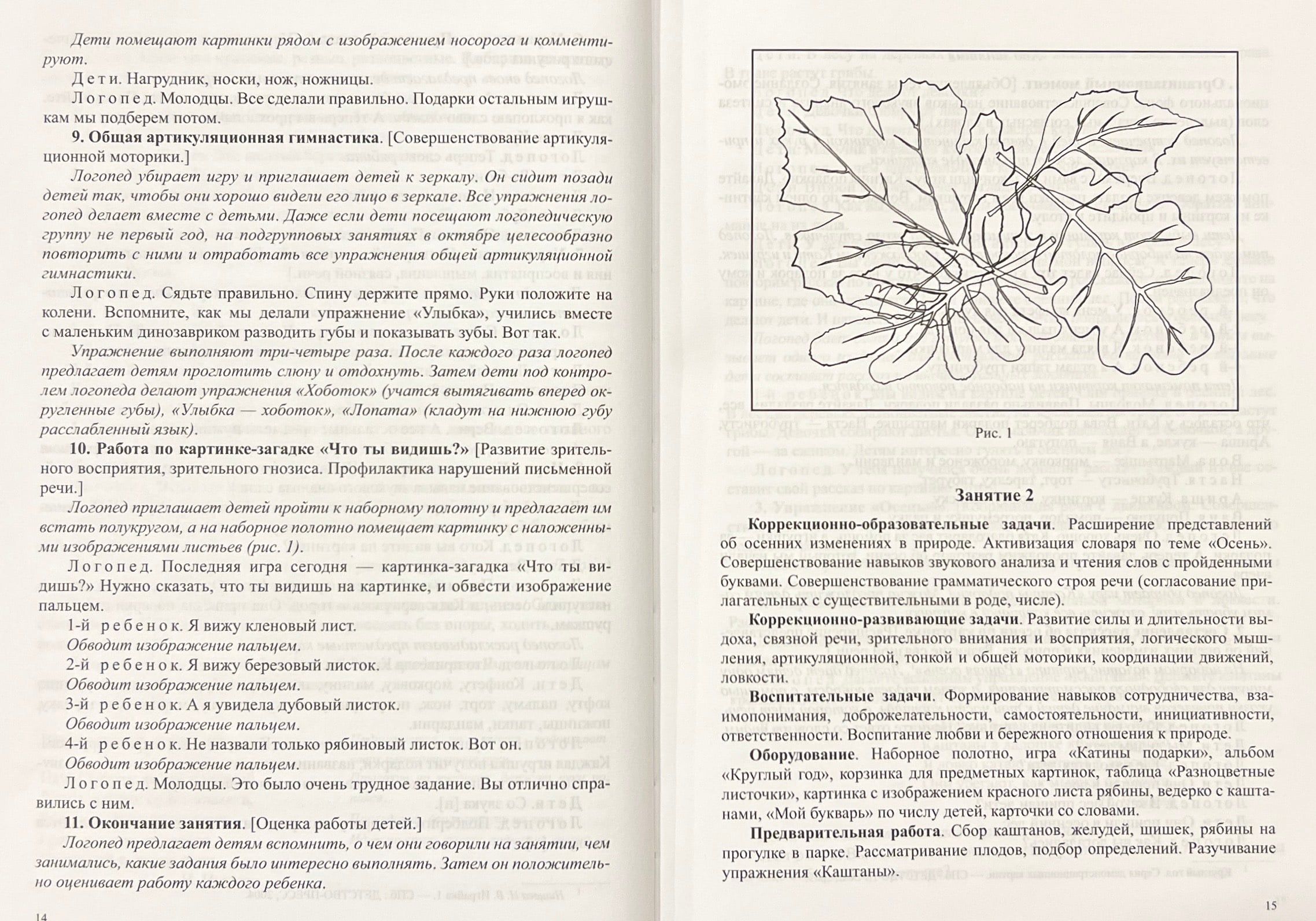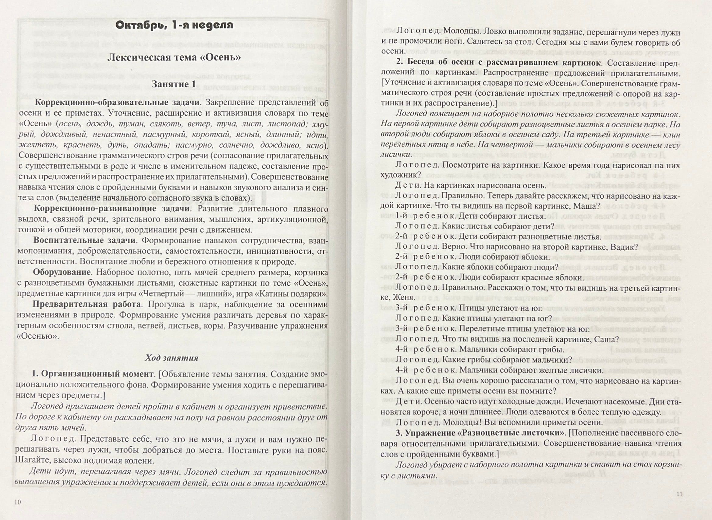 . Katra nodarbība ietver desmit posmus: spēles, uzdevumi un vingrinājumi vispārējo runas prasmju, dzirdes un redzes uzmanības un uztveres attīstīšanai, valodas leksiskā sastāva un runas gramatiskās uzbūves veidošanai un pilnveidošanai, saistītās runas un runas komunikācijas attīstīšanai, fonemātisko jēdzienu un skaņu analīzes un sintēzes prasmju, mīmikas, artikulācijas, sīkās, vispārējās motorikas utt. attīstīšanai. Logopēdiem, pirmsskolu logopēdisko grupu skolotājiem.