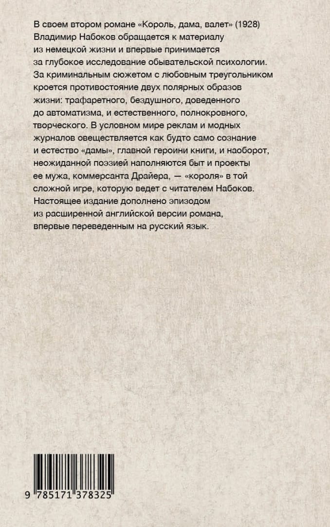 Savā otrajā romānā "Karalis, karaliene, kalps" (1928), kas sarakstīts Berlīnē, Vladimirs Nabokovs pievēršas materiāliem no vācu dzīves un pirmo reizi uzņemas dziļu vidusmēra cilvēka psiholoģijas izpēti, tēmu, ko viņš vēlāk turpināja romānā "Camera Obscura" un "Despair". Aiz kriminālsižeta un tā mīlas trijstūra slēpjas meistarīgi atklāta divu polarizētu dzīvesveidu konfrontācija: formuliskā, bezdvēseliskā un automatizētā, un dabiskā, pilnasinīgā un radošā. Reklāmu un modes žurnālu tradicionālajā pasaulē jaunās "dāmas", grāmatas galvenās varones, apziņa un būtība šķiet iemiesota, savukārt viņas vīra, bagātā uzņēmēja Dreijera — "karaļa" sarežģītajā spēlē, ko Nabokovs spēlē ar lasītāju — ikdienas dzīve un projekti ir piesātināti ar negaidītu dzeju. Šo izdevumu papildina epizode no romāna paplašinātās angļu valodas versijas, kas pirmo reizi tulkota krievu valodā.