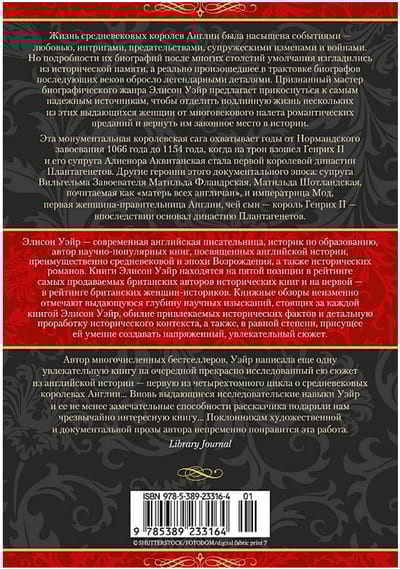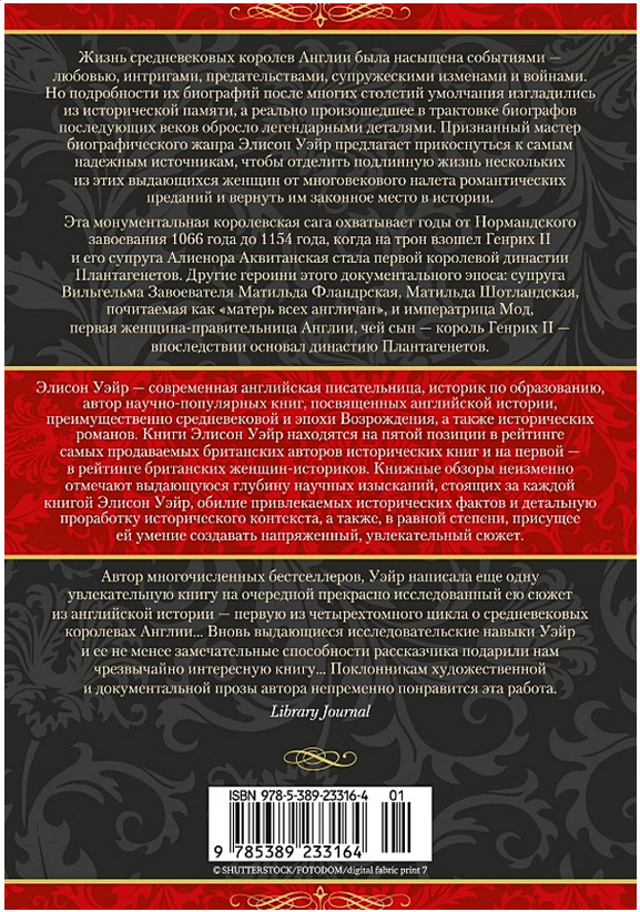 Anglijas viduslaiku karalienes dzīve bija notikumu pilna - mīlestība, intrigas, nodevības, laulības pārkāpumi un kari. Taču viņu biogrāfiju detaļas pēc daudzu gadsimtu klusēšanas izdzēstas no vēsturiskās atmiņas, un reāli notikušais turpmāko gadsimtu biogrāfu interpretācijā pārklāts ar leģendārām detaļām. Atzītā biogrāfiskā žanra meistare Alisona Veira piedāvā pieskarties visuzticamākajiem avotiem, lai vairāku šo ievērojamo sieviešu patieso dzīvi nošķirtu no gadsimtiem krātām romantiskām leģendām un atjaunotu viņām pienācīgo vietu vēsturē. Šī monumentālā karaliskā sāga aptver laika posmu no normāņu iekarošanas 1066. gadā līdz 1154. gadam, kad tronī kāpa Henrijs II un viņa dzīvesbiedre Akvitānijas Alenora kļuva par pirmo Plantagenetu dinastijas karalieni. Starp šīs dokumentālās epopejas varonēm ir arī Vilhelma iekarotāja sieva Matilda no Flandrijas, Matilda no Skotijas, kas tiek godināta kā "visu angļu māte", un imperatore Moda, pirmā Anglijas valdniece sieviete, kuras dēls karalis Henrijs II vēlāk izveidoja Plantagenetu dinastiju.