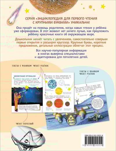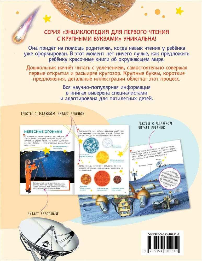 Grāmata iepazīstina bērnus ar plašo kosmosa pasauli. Viņi uzzinās, kas ir Visums, galaktikas, miglāji, Saules sistēma, planētas, zvaigznes un komētas. Bērns atklās aizraujošo kosmosa tehnoloģiju pasauli, astronautu apmācību lidojumiem un astronautu dzīvi SKS. Enciklopēdija ir paredzēta kopīgai lasīšanai vecākiem un bērniem. Lielā drukā rakstītos un ar karodziņu apzīmētos tekstus lasa bērns, bet tekstus uz taisnstūrveida un apaļām plāksnēm lasa pieaugušais.