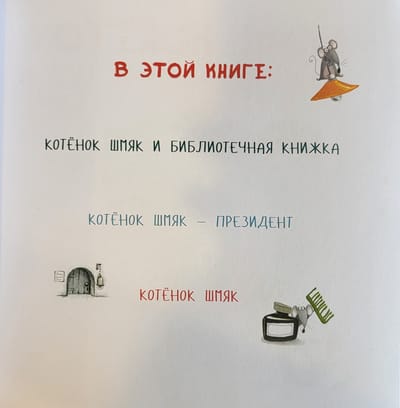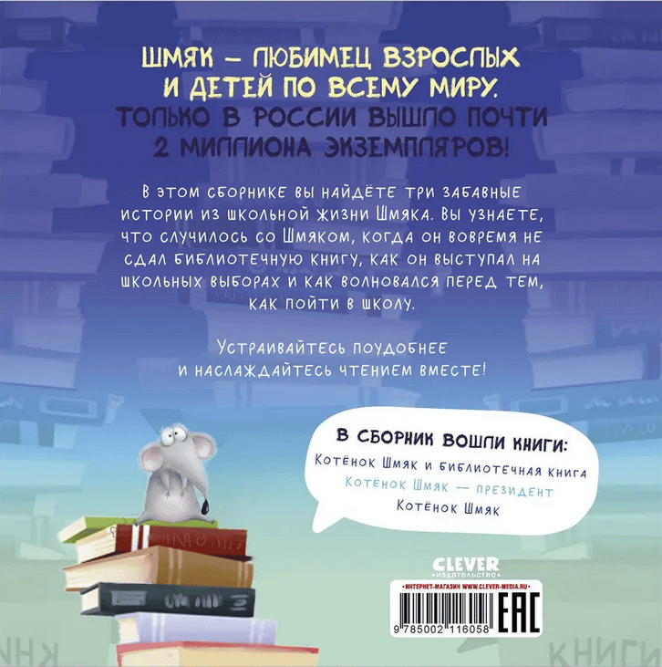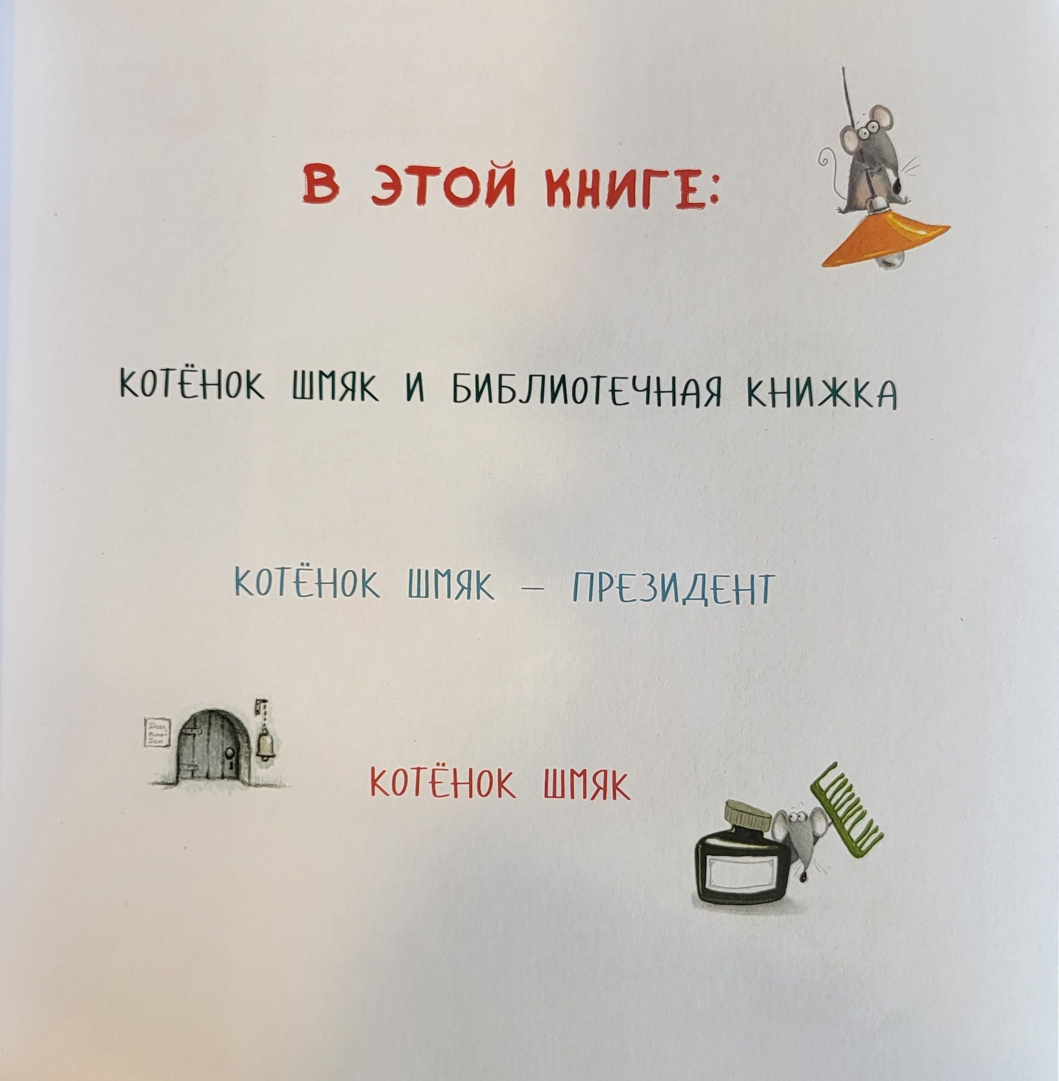 Izkārtojieties ērtāk un izbaudiet lasīšanu kopā. Šajā krājumā iekļautas grāmatas: — Kaķēns Šmaks un bibliotēkas grāmata; — Kaķēns Šmaks — Prezidents; — Kaķēns Šmaks.