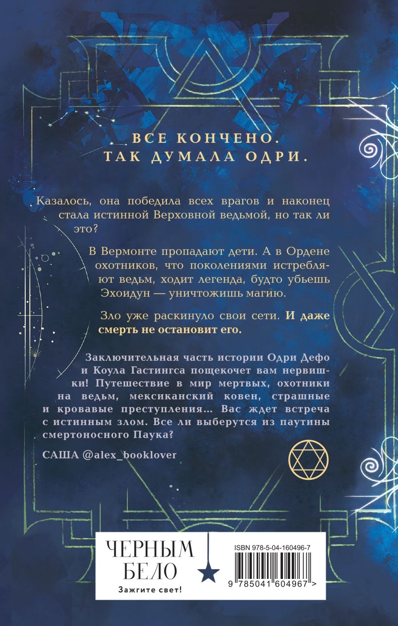 "Viss ir beidzies," Audrija nodomāja. Šķita, ka viņa ir uzvarējusi visus savus ienaidniekus un beidzot kļuvusi par īstu augsto raganiņu. Viņa vairs no nekā nebaidās, jo Pakts ir viņas ģimene viņai līdzās. Tagad Audrijai nāksies noskaidrot, kā tas ir - nest valdīšanas un savas teritorijas aizstāvēšanas nastu. Galu galā Vermontā turpina pazust bērni. Un neviens, izņemot viņu un Kola Hastingsu, nevar apturēt noslēpumaino slepkavu. Ņūorleāna, Santa Muerte coven, mirušo pasaule - kur vēl viņiem būs jādodas, lai to izdarītu? Tikmēr Mednieku ordenī, kas paaudzēm ilgi iznīcina raganas, valda leģenda, ka, nogalinot Ehoidunu, tiek iznīcināta maģija.