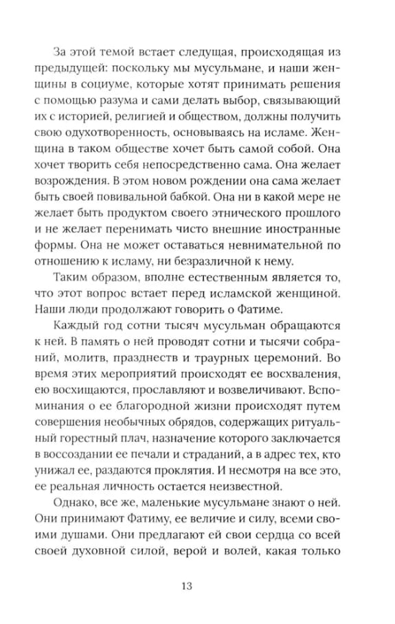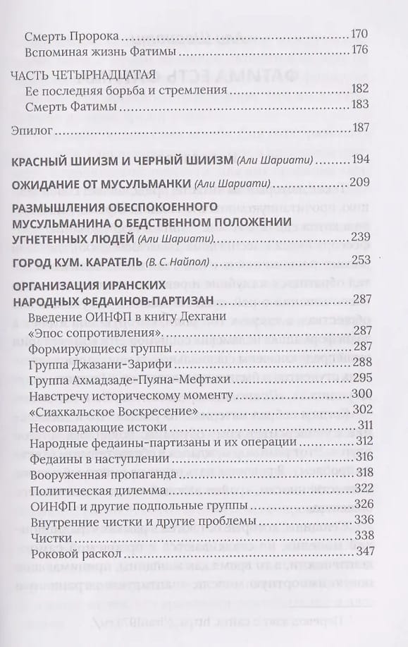 Ali Šariati, ievērojama persona Irānas islāma revolūcijā, prasmīgi apvienoja šiismu un sociālismu. Viņa idejas lika pamatus islāma "atbrīvošanas teoloģijai" un būtiski ietekmēja palestīniešu atbrīvošanas kustību un sociālo politiku mūsdienu Irānā. Šariati aizstāvēja sieviešu tiesības Irānā, islāma feminisma saknes meklējot Fatimas personā. Viņa interpretācijā Fatima ir centrālā persona visā islāma humānistiskajā un apgaismotajā tradīcijā. Grāmatā ir aprakstīta arī Irānas kreiso partizānu (fedajīnu) vēsture, kuri cīnījās pret Šaha režīmu un vēlāk kopā ar šiītu garīdzniecību iebilda pret Šahu, kā arī Amerikas un Izraēlas imperiālismu. Fedajīni lielā mērā balstījās uz Ali Šariati idejām.