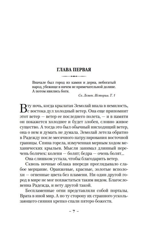 Radēžas pilsētvalsts ir sadalīta piecās sektās, katra pielūdzot savu dievu. Jaunā Zemolaja, dzimusi rakstu mācītāju sektā, jau no mazotnes sapņoja kļūt par karotāju, pievienoties sava dieva sektai un iegūt tiesības uz spārniem, lai aizsargātu savas mīļotās pilsētas iedzīvotājus. Zemolajas sapnis piepildās, viņai ir spārni, un divdesmit sešus garus gadus viņa uzticīgi dien spārnotajā armijā. Taču kādu dienu viss sabrūk. Atgriežoties no cita pienākuma, viņa izdara pārkāpumu, kas nav savienojams ar stingrajām normām, ko viņām noteikusi dievība. Viņa izrāda žēlumu, kas ir nepieņemama žēlsirdības izpausme cilvēkam, kurš pielūdz kāda cita dievu. Un nekavējoties zaudē visu, kā dēļ ir dzīvojusi. Cenšoties saprast notikušo, Zemolaja sāk apzināties, ka valsts, kuru viņa aizstāvēja, un dievi, kas guļ kaut kur debesīs, nav pamats, uz kura balstās pasaule, un vienīgais, kas viņai atliek, ir nostāties to pusē, kas iebilst pret šo tirāniju.