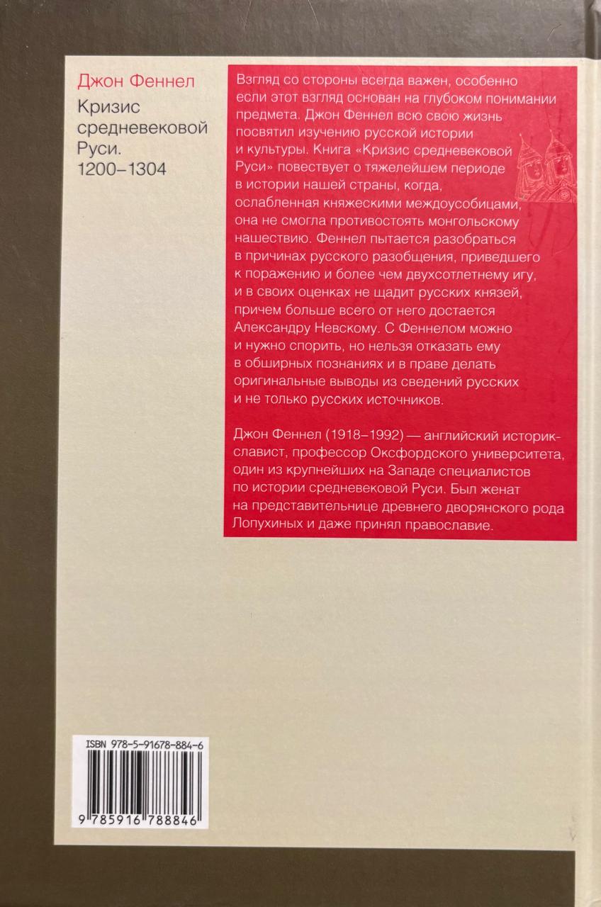 Ārēja perspektīva vienmēr ir svarīga, īpaši, ja tā balstās uz dziļu priekšmeta izpratni. Džons Fenels visu savu dzīvi veltīja Krievijas vēstures un kultūras izpētei. Savā grāmatā "Viduslaiku Krievijas krīze" ir aprakstīts vissarežģītākais periods mūsu valsts vēsturē, kad, novājināta kņazu nesaskaņu dēļ, tā nespēja pretoties mongoļu iebrukumam. Fenels cenšas izprast Krievijas sašķeltības cēloņus, kas noveda pie sakāves un vairāk nekā divus gadsimtus ilgas apspiešanas, un savos vērtējumos viņš nežēlo nevienu Krievijas kņazu, un Aleksandram Ņevskim jāuzņemas galvenā atbildība. Ar Fenelu var un vajag strīdēties, taču nevar noliegt viņa plašās zināšanas un tiesības izdarīt oriģinālus secinājumus no krievu un citiem avotiem.