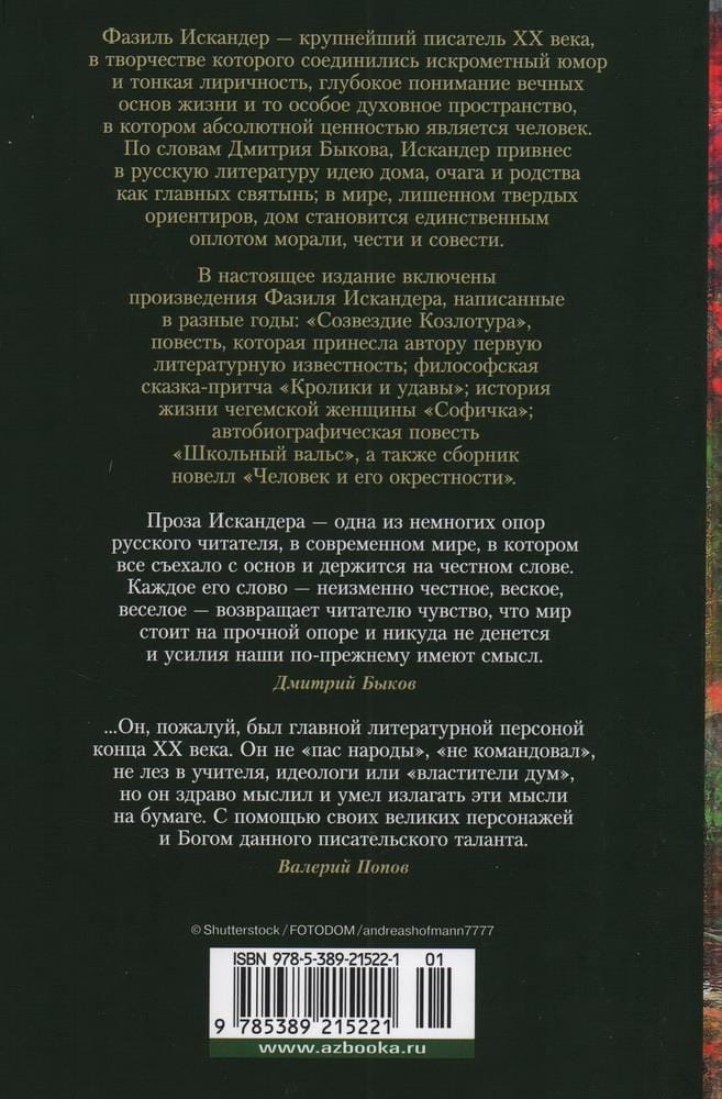 Fazils Iskanders ir izcilākais divdesmitā gadsimta rakstnieks, kura daiļradē apvienojas dzirkstošs humors un smalks lirisms, dziļa izpratne par dzīves mūžīgajiem pamatiem un īpaša garīgā telpa, kurā absolūta vērtība ir cilvēks. Pēc Dmitrija Bykova domām, Iskanders ienesis krievu literatūrā ideju par mājām, sētu un radniecību kā galvenajām svētvietām; pasaulē, kurā trūkst stingru vadlīniju, mājas kļūst par vienīgo morāles, goda un sirdsapziņas bastionu. Šajā izdevumā iekļauti dažādos gados tapušie Fazila Iskandera darbi: "Kozlotūras zvaigznājs" - stāsts, kas atnesa autoram pirmo literāro slavu; filozofiskā pasaka-pasaka "Truši un bosi"; čeģes dzīvesstāsts "Sofička"; autobiogrāfiskais stāsts "Skolas valsis", kā arī stāstu krājums "Cilvēks un viņa tuvinieki".